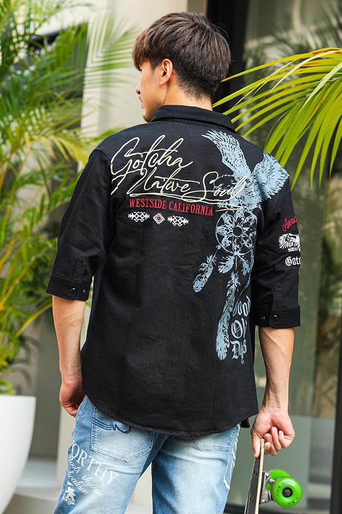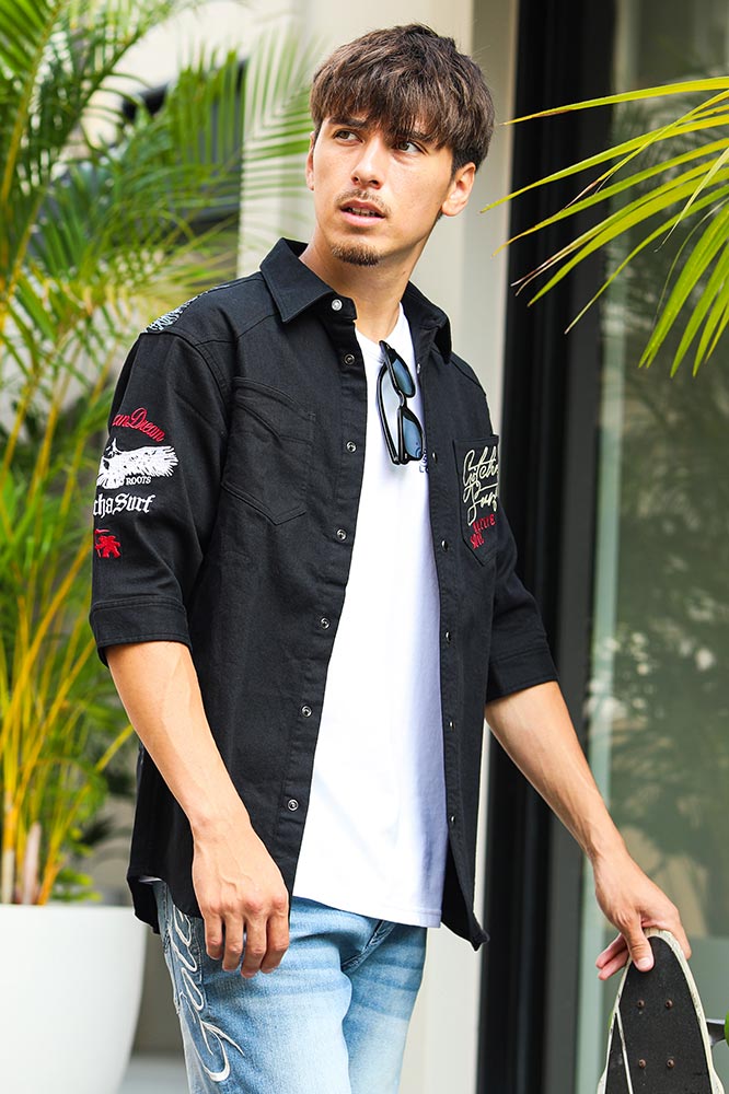 ブラックはデニムと合わせた王道サーフスタイルで。 先ほどのゆるっとしたシルエットではなく、ほど良いシルエットで生地が薄く残暑にピッタリのライトオンスデニムがGOOD。