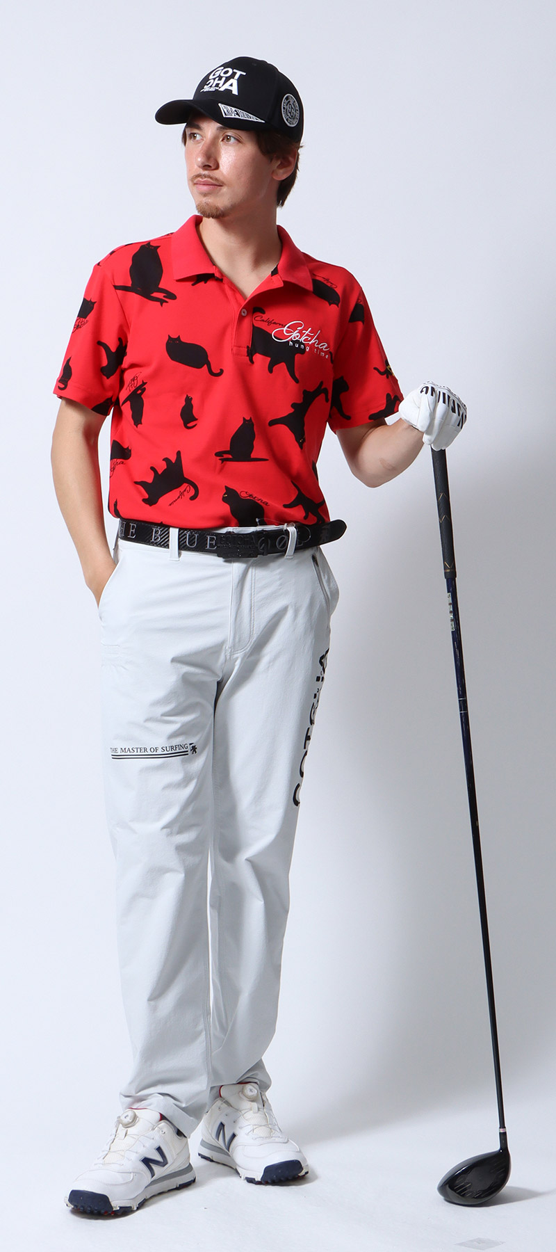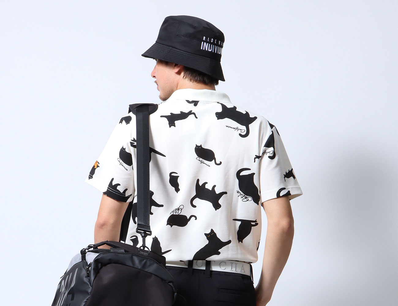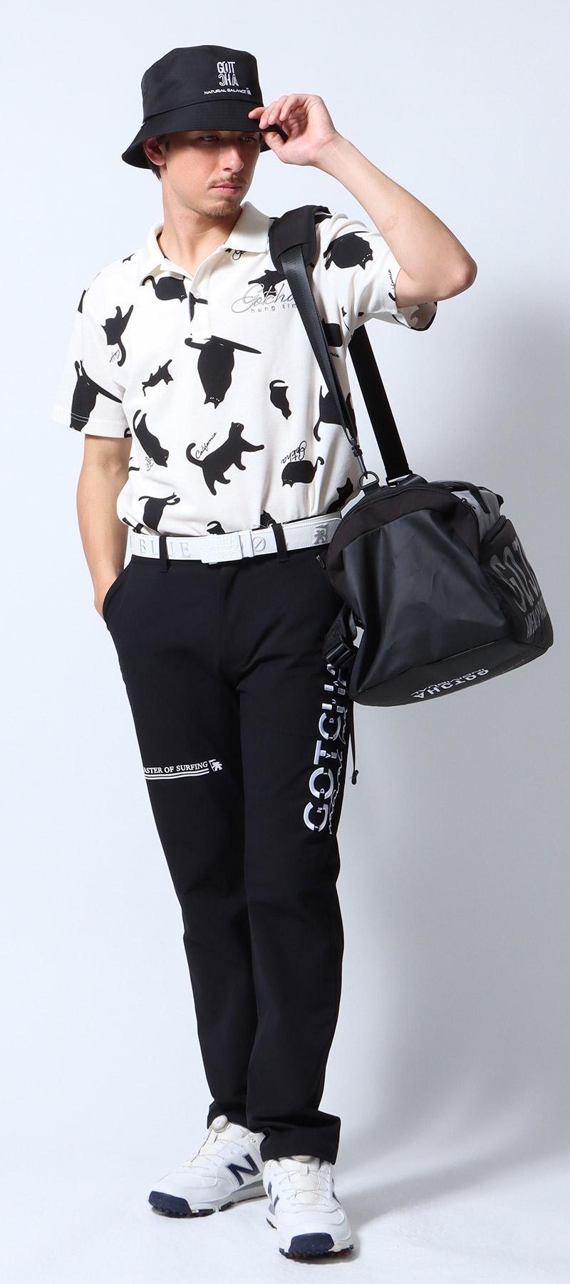 総柄の猫ポロは、シンプルなパンツと合わせるだけで主役級の着こなしに。柄のインパクトを活かして、ボトムスは無地ですっきりまとめるのが正解。タウンユースとしては足元はスニーカーで軽快に。ちょっと遊び心を足したい日はキャップやサングラスをプラスしても◎。ゴルフだけでなく日常の様々なシーンにハマる、こなれた大人カジュアルが完成します。
