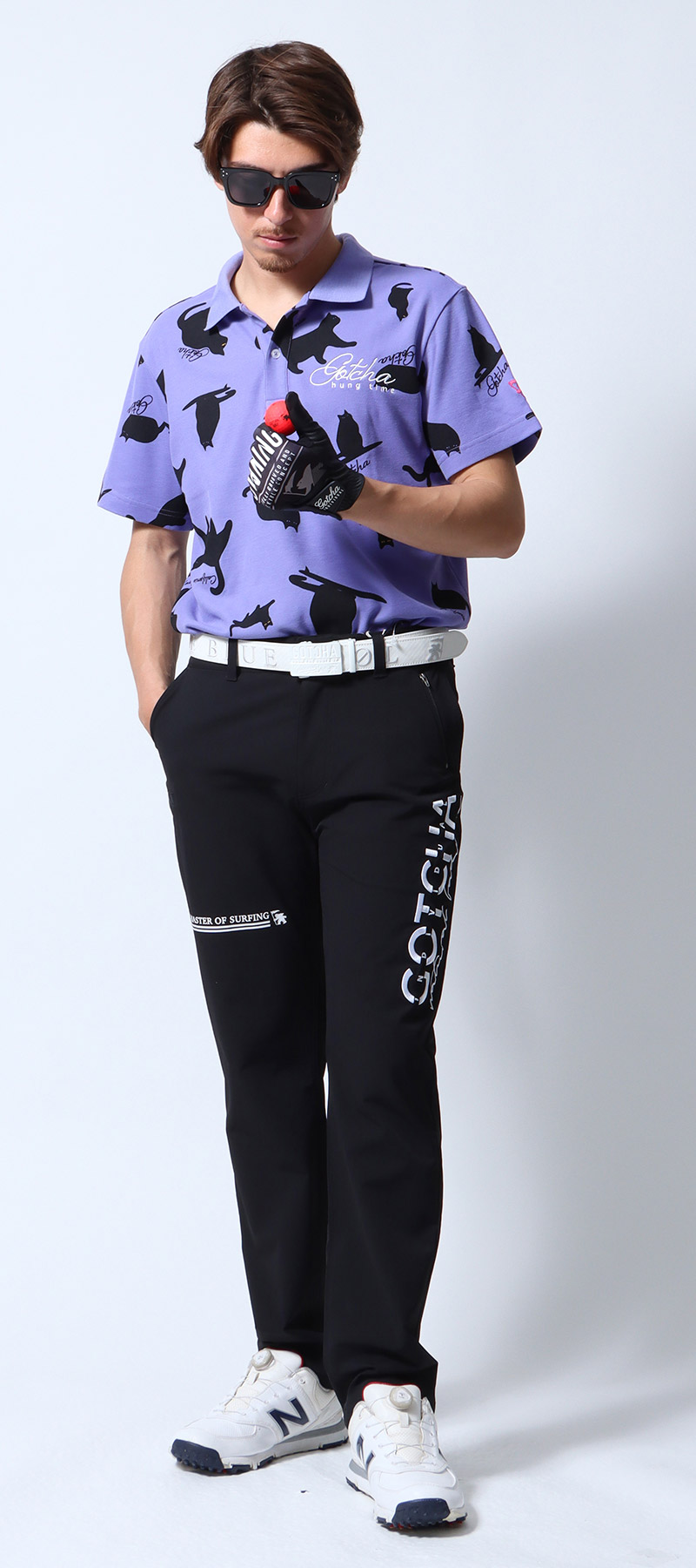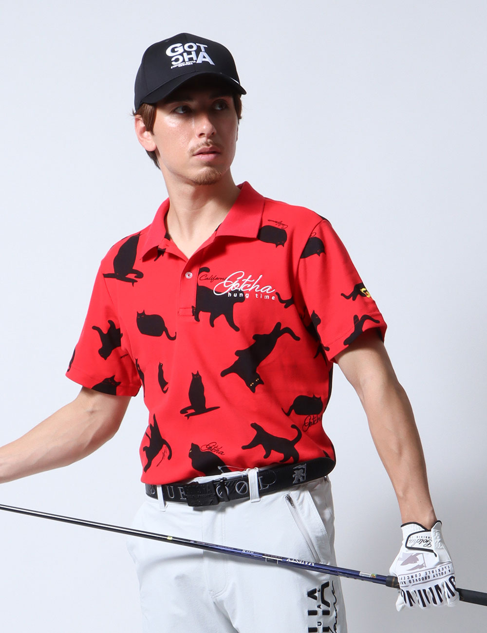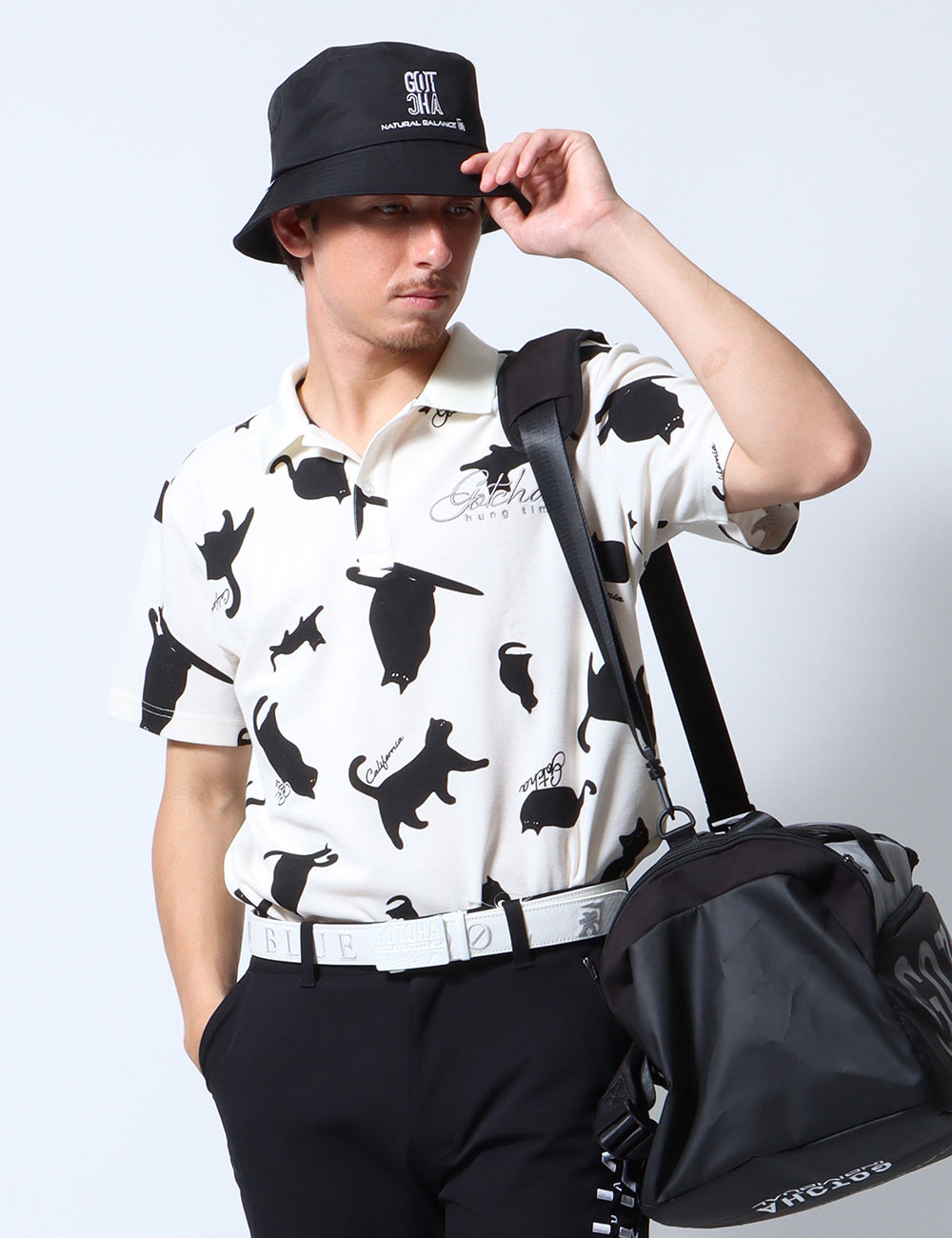 総柄の猫ポロは、シンプルなパンツと合わせるだけで主役級の着こなしに。柄のインパクトを活かして、ボトムスは無地ですっきりまとめるのが正解。タウンユースとしては足元はスニーカーで軽快に。ちょっと遊び心を足したい日はキャップやサングラスをプラスしても◎。ゴルフだけでなく日常の様々なシーンにハマる、こなれた大人カジュアルが完成します。