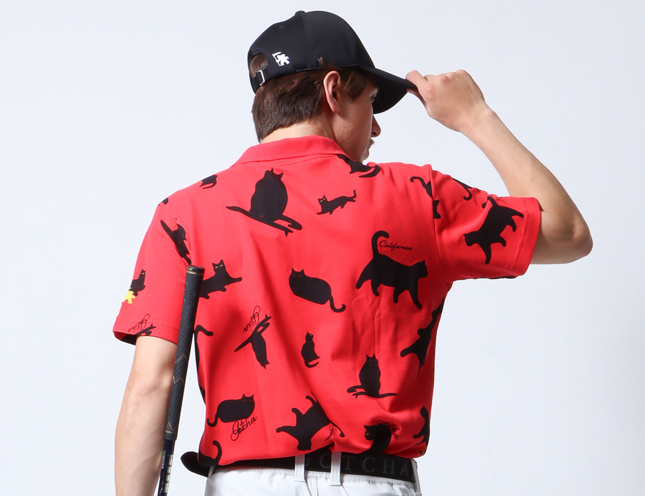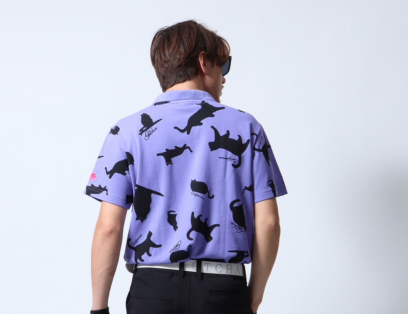 このポロシャツは、サーフィンを楽しむ猫や、こちらを見つめる猫など、さまざまな表情を持った黒猫たちが総柄で描かれたユニークなデザインが特徴。まるで物語のような楽しい雰囲気を感じさせ、シンプルながらも個性が光る、遊び心あふれる一枚。