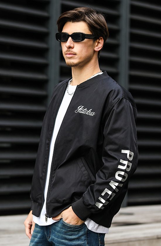 袖のシルバープリントがブラックに映え、