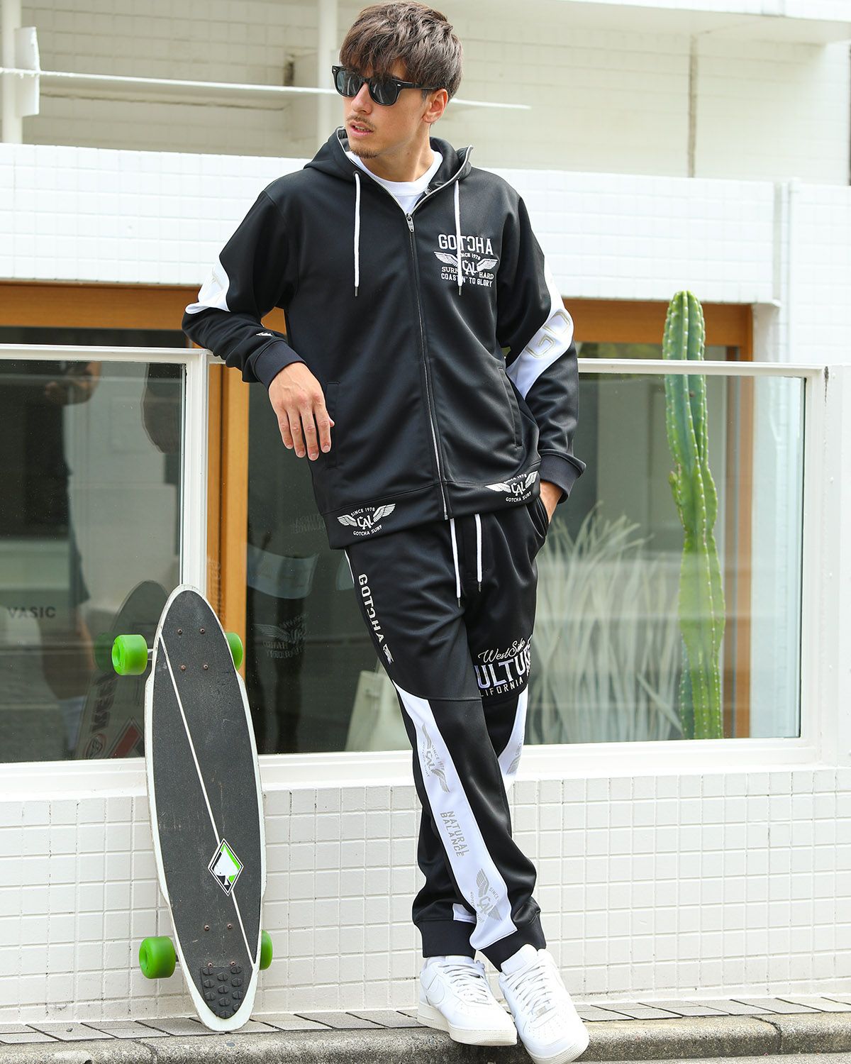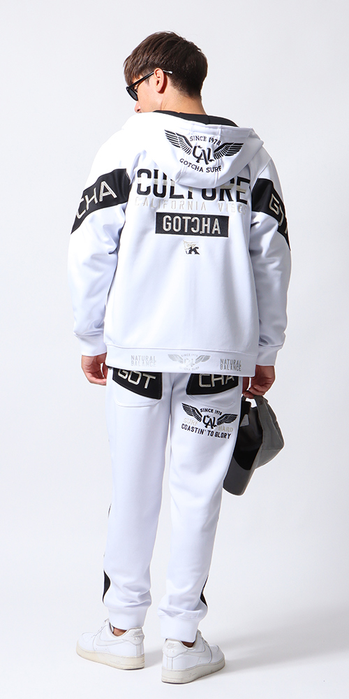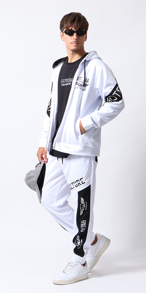 大胆に、華やかに。動きも輝きも、妥協しない GOTCHA METALLIC OUTFITS 2025.09.29 GOTCHA特集一覧 大胆に、華やかに。動きも輝きも、妥協しないGOTCHA METALLIC OUTFITS メタリック刺繍とは…? メタリック刺繍とは、金属的な光沢を持つ糸(ラメ糸やメタリック糸)を使って施された刺繍のこと。通常の刺繍よりも視覚的なインパクトが強く、光の当たり方によってキラッと輝くのが特徴。 METALLIC ZIP HOODIE & PANTS メタリック 袖切替ジップパーカー ¥11,990(tax in) BUY メタリック 切替イージーパンツ ¥10,990(tax in) BUY 詳細・特徴 FEATURES メタリック加工が生む高級感 ラメ刺繍・刺繍・ラバープリント・箔プリントを巧みに組み合わせ、1枚でラグジュアリーな印象を演出。ラメ刺繍と箔プリントのカラーを統一することで、全体に洗練されたまとまりを持たせています。 インパクト抜群の切替デザイン 両袖をぐるりと囲む大胆な切替とビッグロゴが、視線を集めるアクセントに。シンプルなコーディネートでも主役級の存在感を放ちます。 スポーティーな素材感と快適な着心地 つるっとした軽やかな素材は、肌触りも良く、アクティブな動きにもストレスなく対応。日常使いからスポーツシーンまで幅広く活躍します。 ストリート×ラグジュアリーの絶妙バランス ストリートテイストの大胆なロゴや切替に、メタリックの輝きが加わることで、カジュアルながらも高級感のあるスタイルに。都会的なセンスが光ります。 バリエーション BLACK ストリート×スポーツの融合。動きもスタイルも妥協しないセットアップ ブラックは、スポーティーなジャージ素材に切り替えで入れられた白のラインがシャープなアクセントに。フード付きのジップアップパーカーとジョガーパンツの組み合わせは、動きやすさとスタイルを両立した理想的なコーディネート。 胸元とパンツに施されたロゴプリントが、ストリート感をプラスし、白スニーカーとサングラスの合わせ技で、アクティブな印象をさらに強調。メタリックの輝きが、シンプルなスタイルに個性を添え、周囲と差をつける一着です。 180cm セットアップLサイズ着用 WHITE 秋の街に映える、洗練されたホワイトセットアップ 白×黒のモノトーンセットアップが、秋の街に映える。軽やかな素材感とメタリックなディテールが、季節の変わり目にちょうどいいバランス。フード付きジャケットの黒ラインがシャープな印象を与え、パンツのサイドロゴがストリート感をプラス。 インナーには黒Tを差し込んで、コーデに奥行きを。サングラスを合わせれば、秋晴れの街にもぴったりなアーバンスタイルが完成。街歩きやカフェ巡りなど、秋のアクティブな日常にフィットするセットアップ。モノトーンの配色が、紅葉や秋空にも映える、洗練された一着です。 180cm セットアップLサイズ着用 METALLIC ZIP HOODIE & PANTS メタリック 袖切替ジップパーカー ¥11,990(tax in) BUY メタリック 切替イージーパンツ ¥10,990(tax in) BUY Other Feature