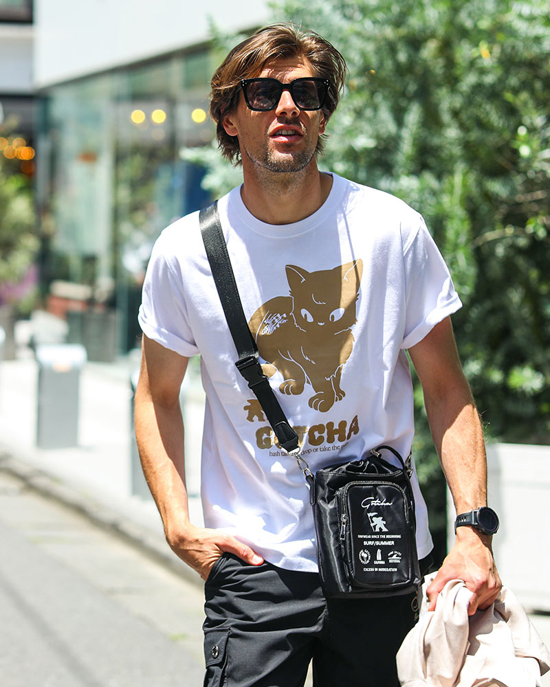 都会派サーフはアースカラーでやや色落ち着かせるのが今年流。グラフィックは愛くるしい猫モチーフを選びつつ、袖をまくりシルエットをスッキリさせることでオトナの着こなしに。ショーツも膝が隠れる程度の丈選びがポイント。今回は都会派の定番ブラックカーゴでペーシックに。香水も都会的な印象のオリエンタルウッドを1プッシュ。