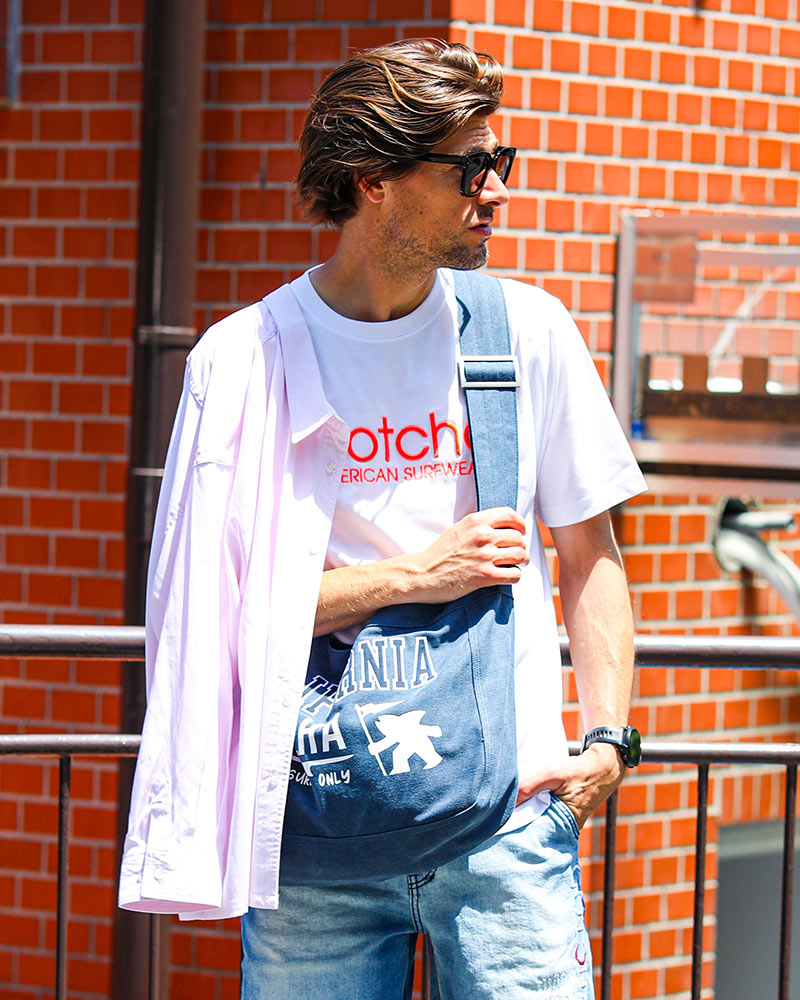 お出かけでも多い海沿いなどのやや自然派シーン。アウトドア過ぎず都会派過ぎずのいい塩梅をのコーデは白T×デニムショーツが◎。白Tは晴天と相性抜群のネオンカラー使いがGOOD。BAGもレザーではなくキャンバスやナイロンなどを選ぶことでスタイリングもまとまる。香水は清潔感のあるペパーミントの香りがたまらないブルーシダーを1プッシュ。