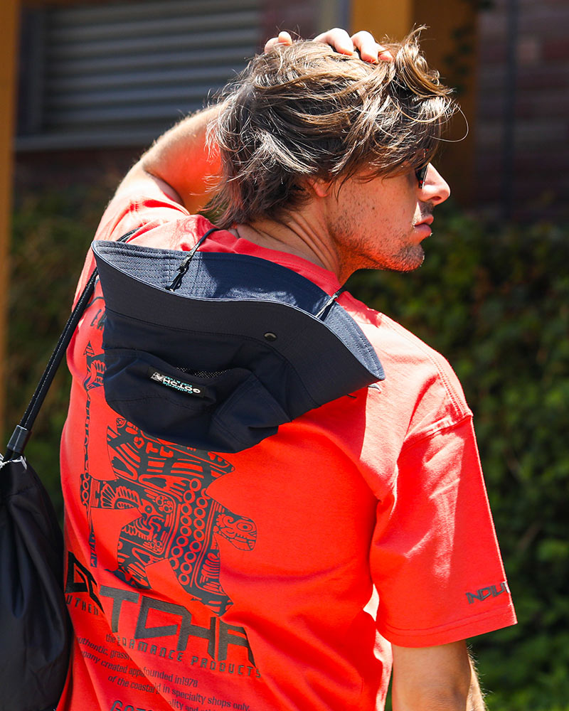 アウトドアはやっぱり明るいカラーを取り入れてパッション全快でいくのが◎。ただし明るいカラーでもネオンのような派手な色味ではなく、くすみなどのある落ち着いたモノがGOOD。やや落ち着いたサーモンピンクとカーキの組み合わせたが自然にマッチ。アウトドア仕様のような総柄で描かれたフィッシュマンも良いアクセントに。バケハは多機能の優れものをチョイス。自然を楽しので香水は不要だ。