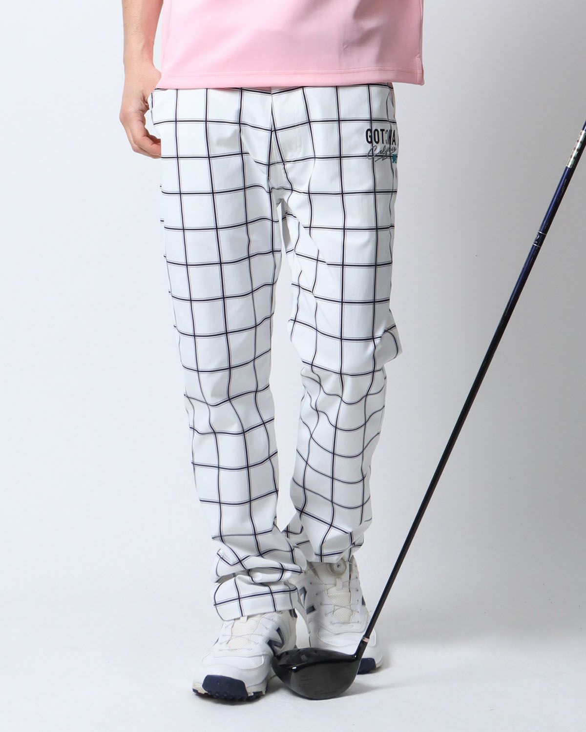 しっかりとした素材感と独特の凹凸模様が特徴。ウエストはドロスト入りでベルト要らずで穿けるイージー仕様に。ゴルフ場でも快適に過ごせる通気性と動きやすさを兼ね備えています。