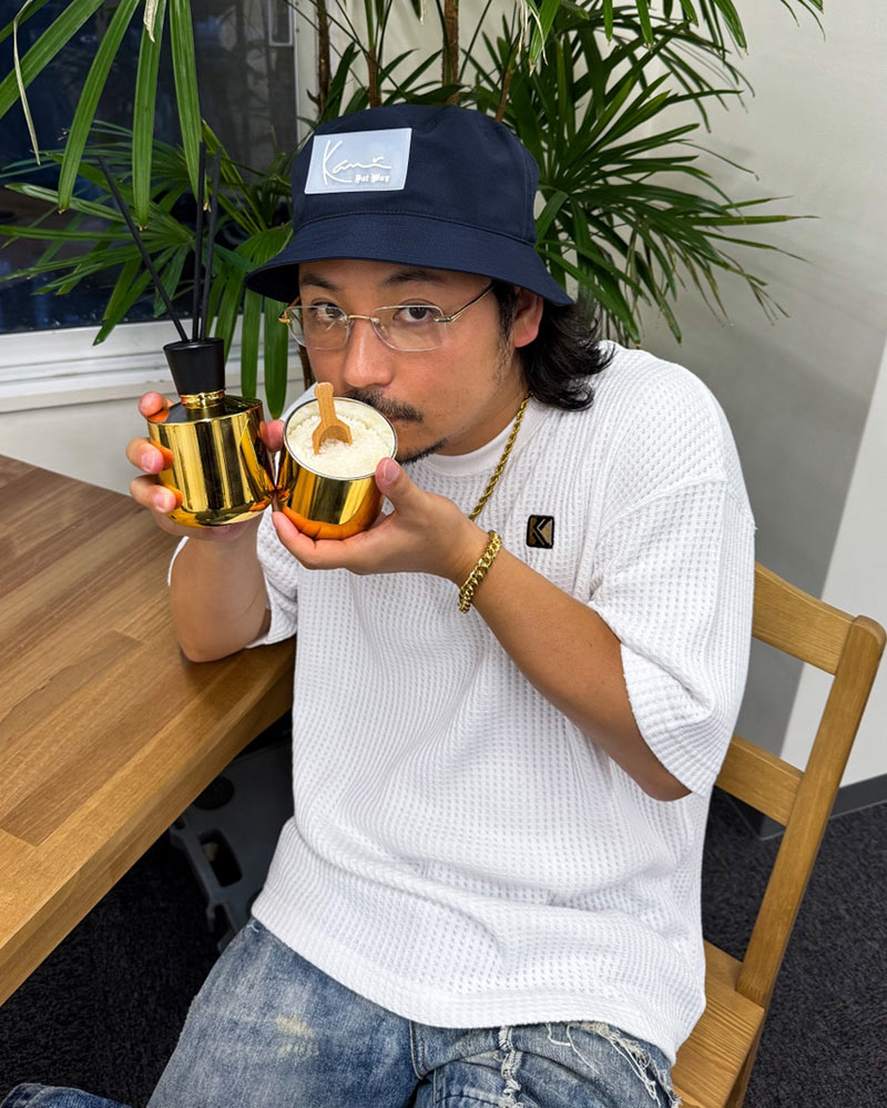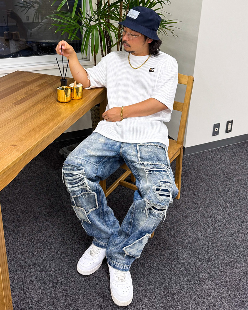 夏のド店番「白TEE×デニムパンツ」。これをKANI流に!デニムはRAPPIイチオシで毎度スナップでも履いてるワイドストレートでややゆったりシルエットのダメージデニム。これに今回はビッグワッフル素材の1ポイントTEEをチョイス。このTEE、実は今までのシルエットと違い、ややボックス型で身幅が広く丈はやや短いのがポイント。シンプルな合わせだからこそシルエットは大事に!と、インナータンクも忘れずに!ただこれだけでは寂しいので、ネービーカラーのバケハやブレス、ネックレス、メガネでストリート感をプラス。KANI流「白TEE×デニムパンツ」の完成。ただーーー!!!ここまででマットは1枚なので、非売品のマットは2枚欲しい…でも服ばっかりいらない…そんな方必見!KANI大阪、越谷、WEBのみで販売中のジャラハニーシリーズもこの機会にぜひトライ♪バスソルトは汗どっさり出て気持ちいいですよ!