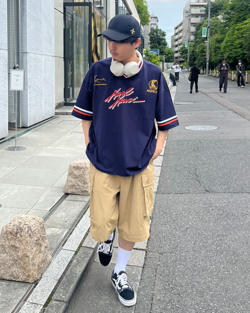 そこにスポーツテイストをモチーフにしたオレンジのプリントやイエローの刺繍が良いアクセントに!ユニフォーム風デザインをベースに、ストリートファッションに落とし込んだTシャツとワイドカーゴショーツは、あえて大きめサイズでラフに着こなすことで、よりストリートなスタイルに。2枚目の写真では、思わずゴールパフォーマンス風のポーズでパシャリ!遊び心も忘れません(笑)