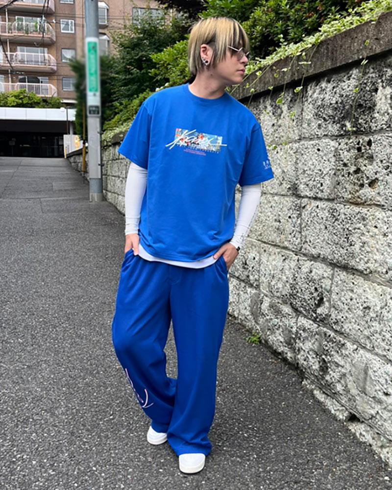 Tシャツとボトムスは共にブルー系ですが若干色味が違いますので、レイヤードで白を挟んで誤魔化しています。
