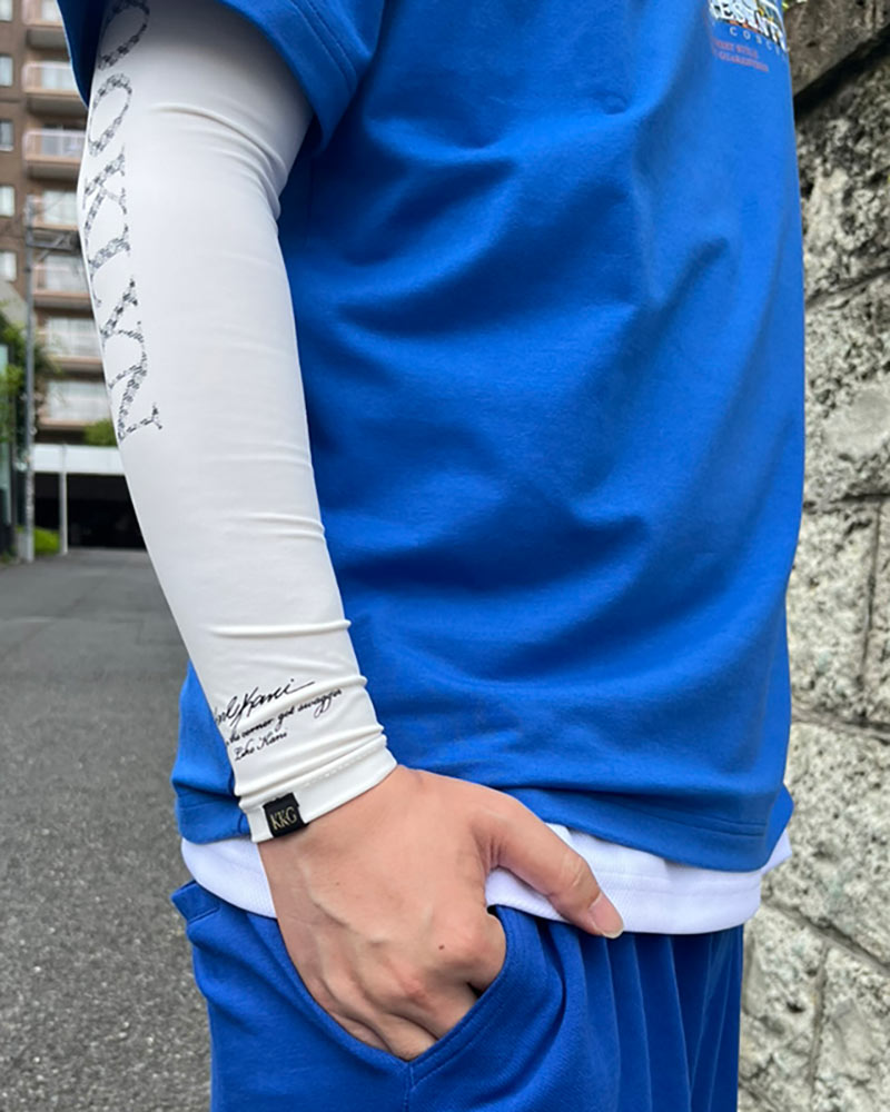 また、アームガードやスニーカーも白にすることでバランスを取り、青にしすぎないコーディネートが完成。