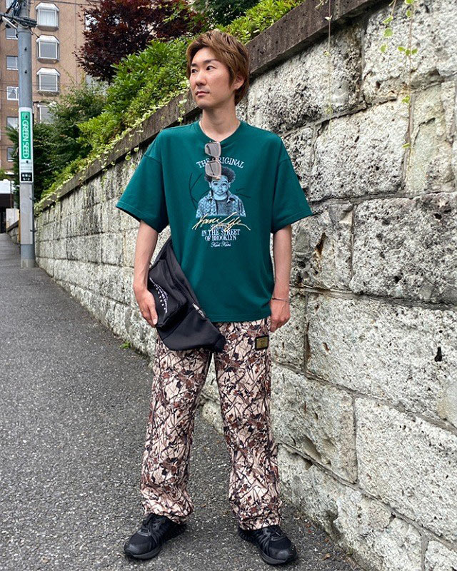 梅雨が明けるともう夏!今年も暑くなりそうですね!僕はこの迷彩柄パンツで灼熱に立ち向かおうと思います(笑)と言うのも、実は裏地がメッシュ素材になっている優れものなんです!穿いた瞬間に風通りを実感!涼しいっ!木がモチーフになった迷彩柄なので、グリーンのTシャツと組み合わせてネイチャー(自然)を感じるコーデに挑戦してみましたよ!配色に馴染んだブラウンのサングラス、バッグやスニーカーはコーデを邪魔しないブラックでまとめました!このコーデで夏を存分に楽しむぞー!(まずは予定を立てよう(笑))
