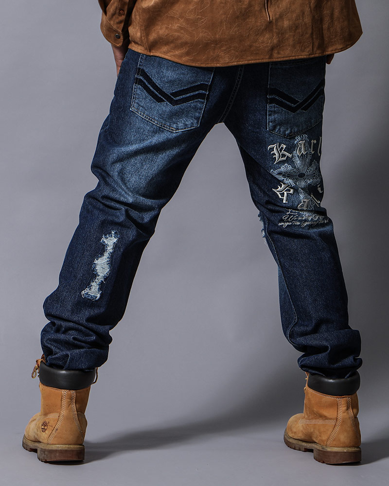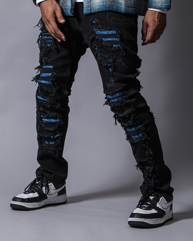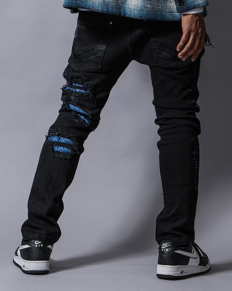 ストレッチ ブルー ダメージ ブラック デニムパンツ