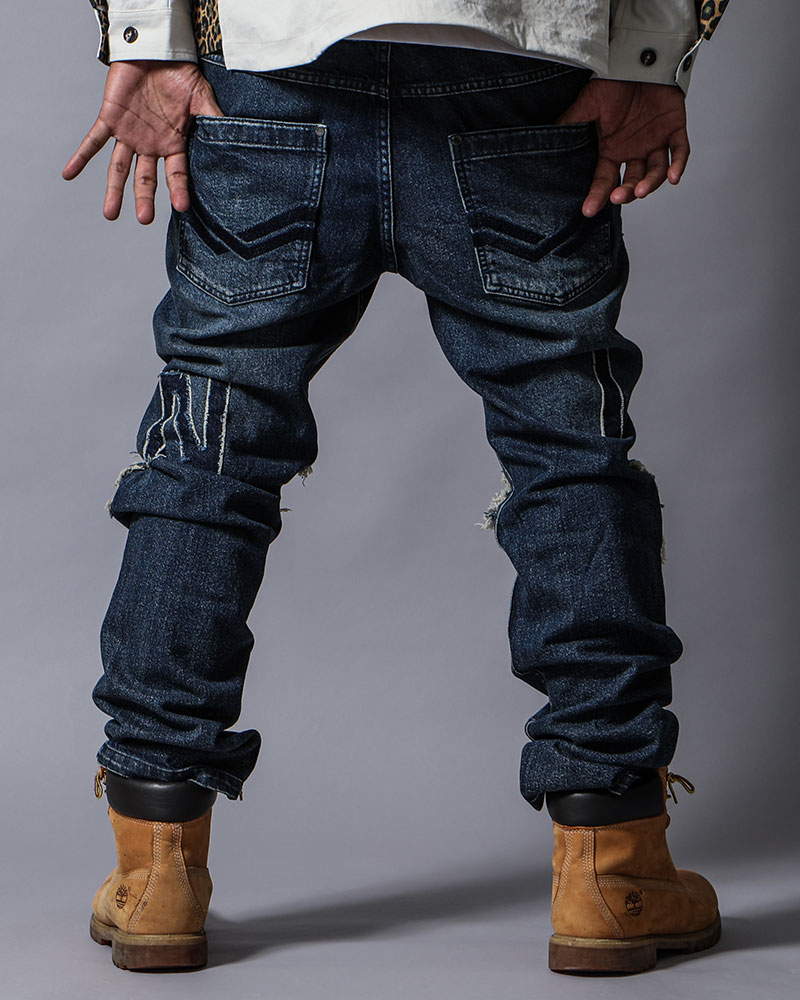 パッチワークで際立つKANIロゴと、大胆に刻まれたダメージ加工。