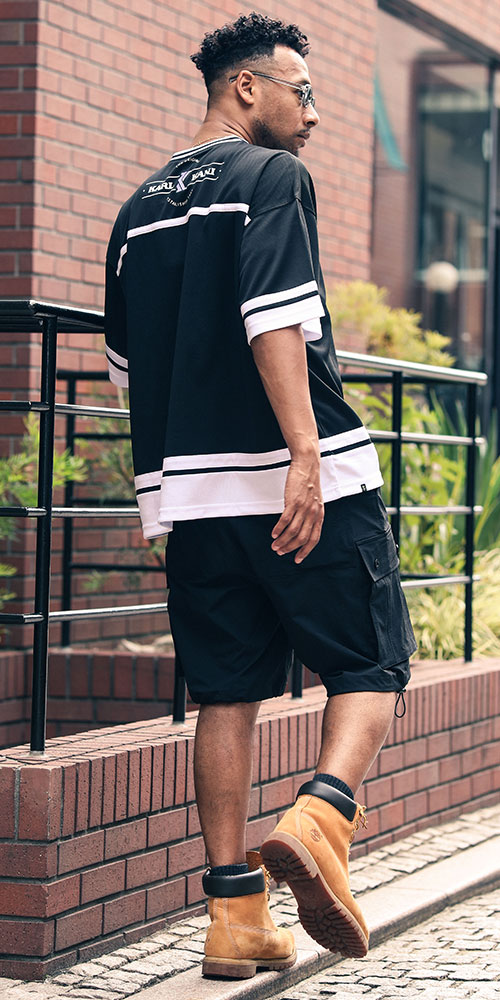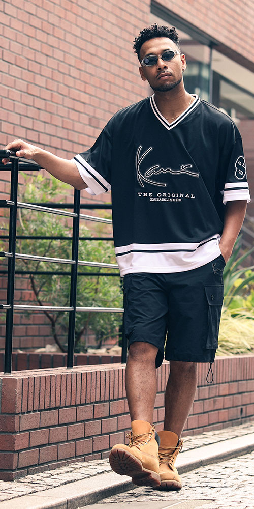 KANI SPORTS MIX -BIG SILHOUETTE MESH T- 2025.05.06 KARL KANI特集一覧 KANI SPORTS MIX-BIG SILHOUETTE MESH T- 90年代のSPORTS MIXスタイルを彷彿させる、今シーズン一押しの1枚が登場 。 ホッケーユニフォームをモチーフにしたデザインで、素材は快適に過ごしやすいメッシュ素材をチョイス。シルエットはボックスタイプにしており、身幅はゆったり、丈は短くスタイルアップ効果もあり、1枚でクールにキマるのも魅力だ。 ビッグシルエット メッシュ 切替 Tシャツ ¥8,990(tax in) BUY BLACK WHITE ビッグシルエット メッシュ 切替 Tシャツ ¥8,990(tax in) BUY Other Feature