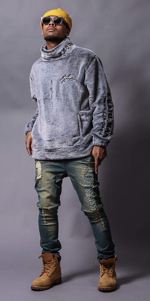 光沢と刺繍で魅せる、洗練されたパーカー