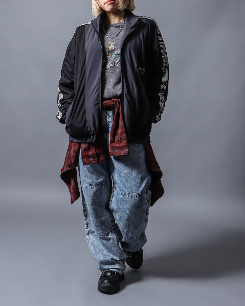 ナイロン×メッシュの異素材の組み合わせで、スポーティでスタイリッシュな印象を演出。ゆったりとしたサイズ感ながら、縦の切り替えデザインが全体をすっきりと見せてくれます。