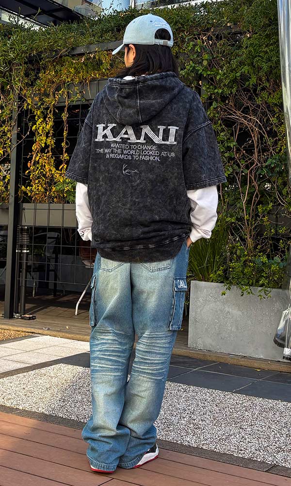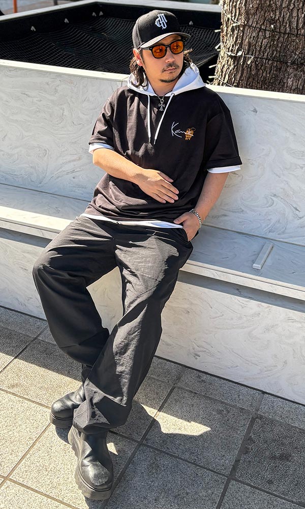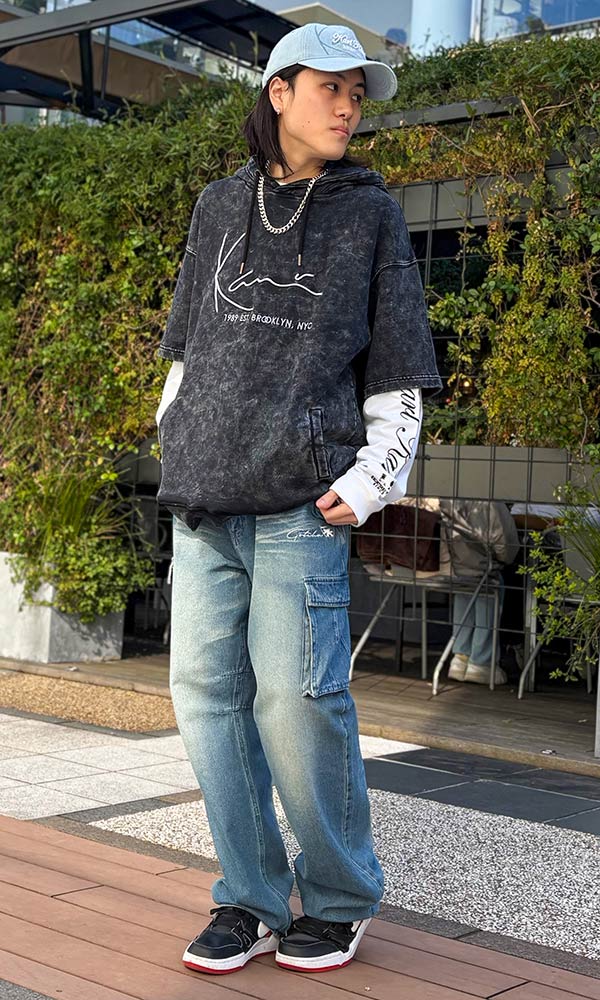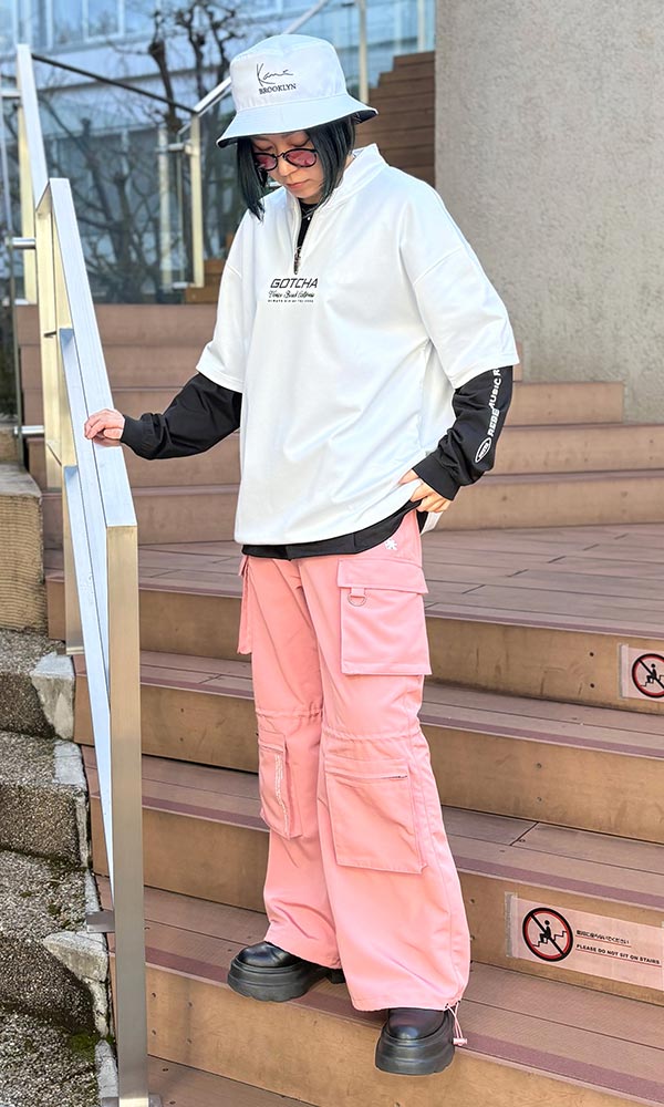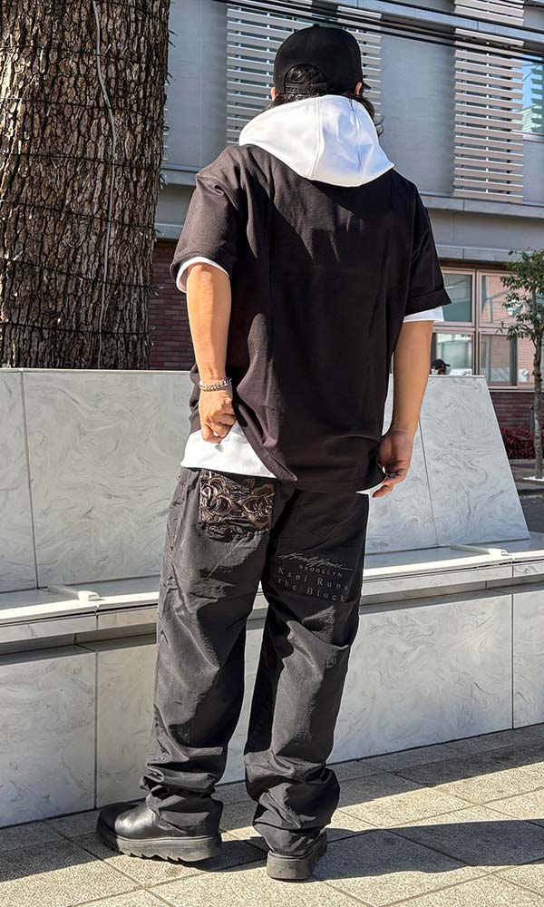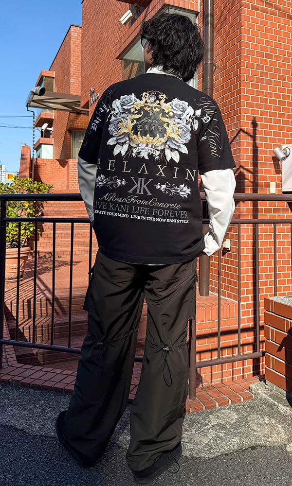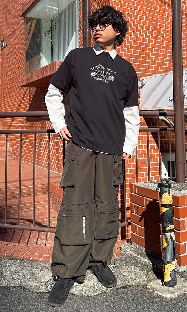 KaniらしいラグジュアリーなデザインのTシャツに合わせて、シャツを使ったレイヤードで上品なきれいめコーディネートに仕上げました。シルバーアクセサリーやサングラスなど小物アイテムとの相性も◎ボトムスはあえてウィメンズラインから登場したカーゴパンツを着用。3通りのシルエットを楽しめるアイテムで、性別問わずサイズが合う方は、ぜひ取り入れていただきたいアイテムです!