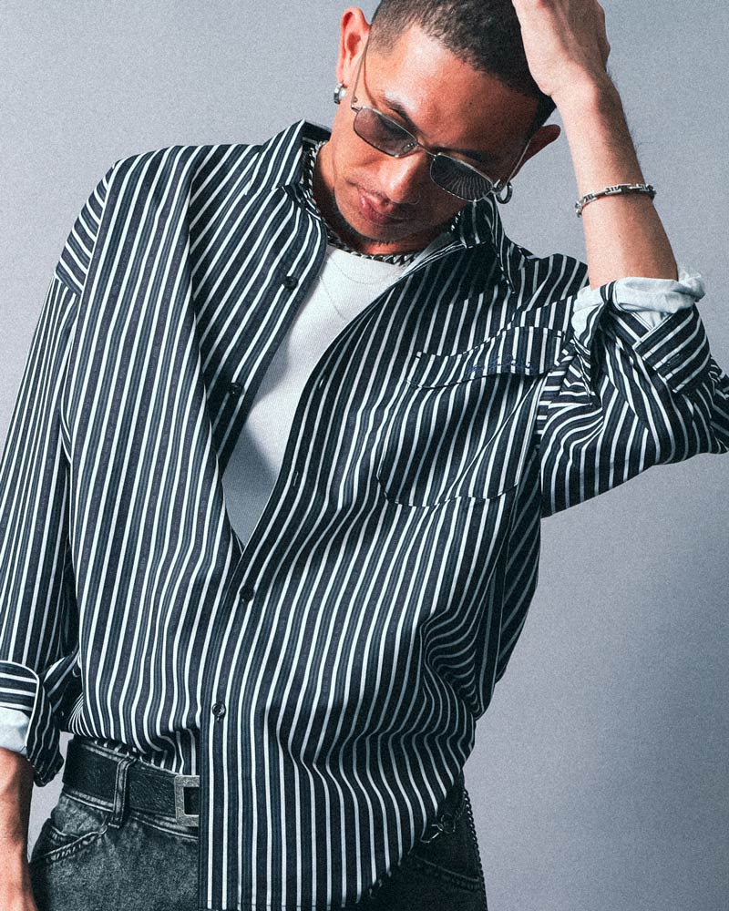 ブラックをメインとしたモードなスタイル。ビッグシルエットのシャツは片側だけインすることで、こなれた印象に。また、ムラブリーチ加工のデニムパンツがワントーンコーデに奥行きをプラスしてくれます。さらにシャープなサングラスを取り入れることで、すっきりとした大人の余裕を感じさせるコーディネートに。
