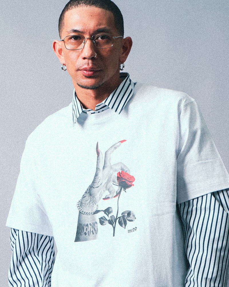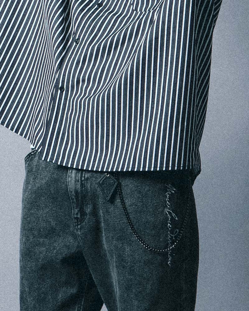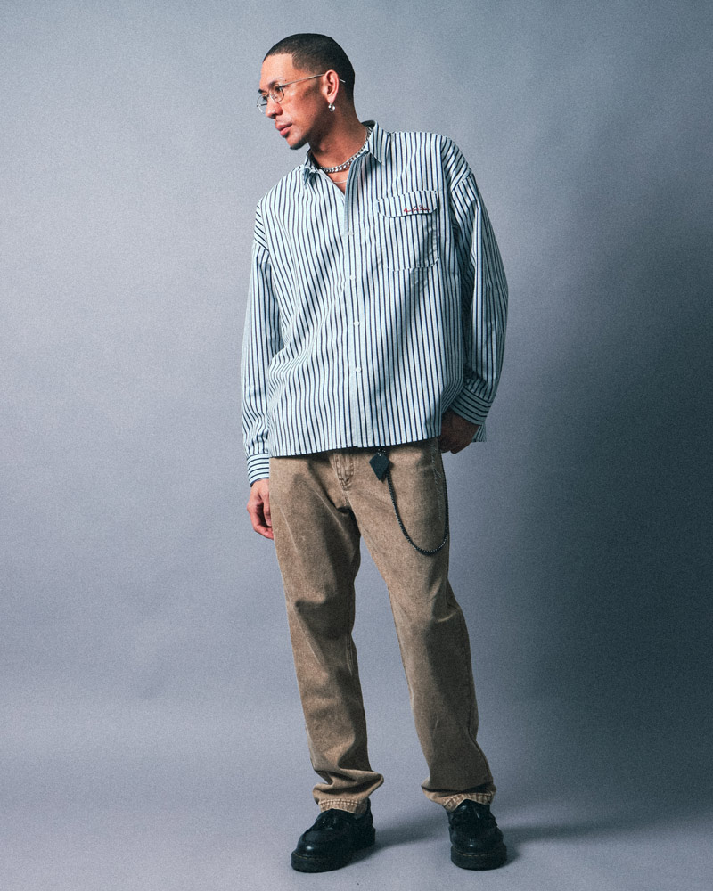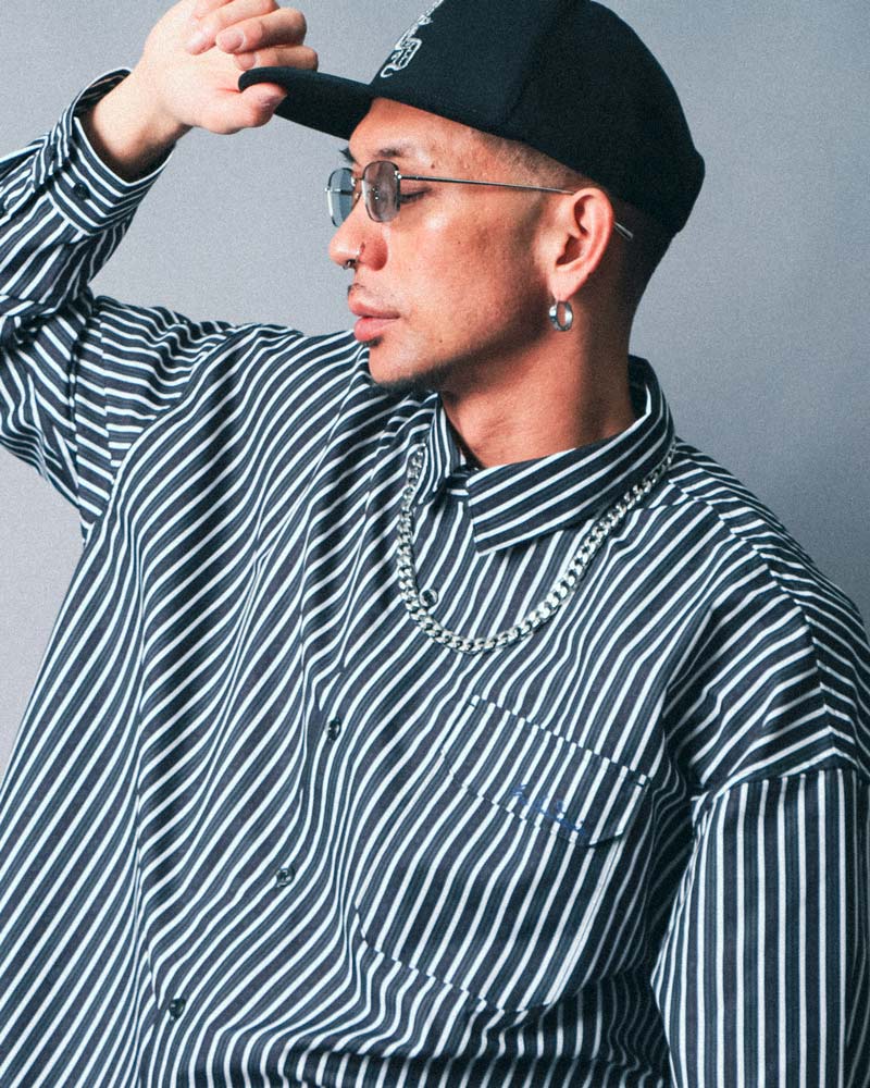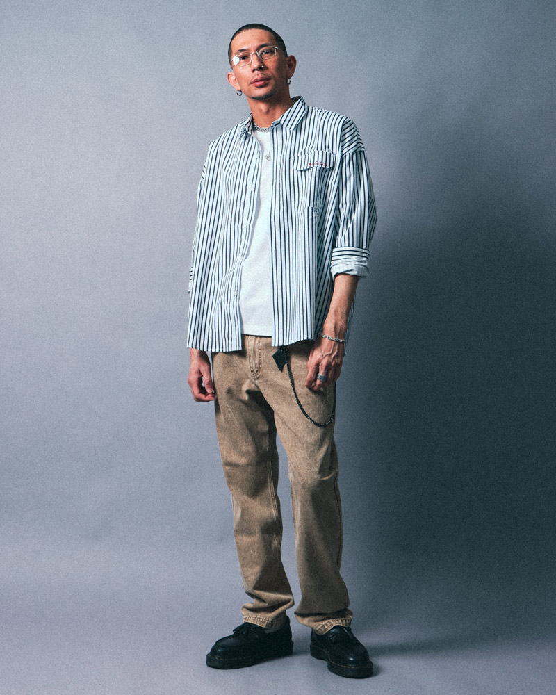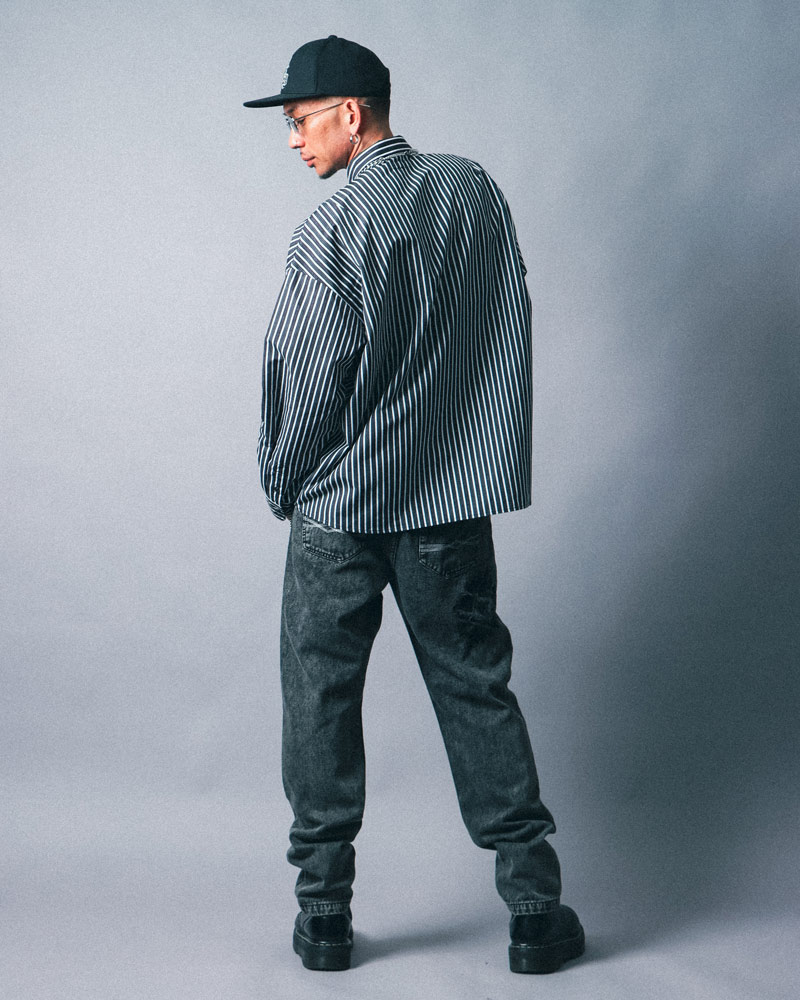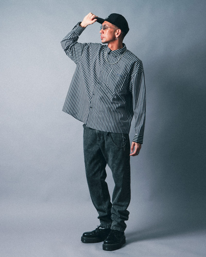 シャツとパンツは変えずに、着こなしをアレンジしたスタイリング。ビッグシルエットなので身体のラインを拾わず、リラックス感のある着こなしも◎シャツはボタンをすべて閉めて、キャップでカジュアルさをプラス。また、ウォレットチェーンを効かせることで、さりげないアクセントを加えたストリート感のある着こなしに仕上げています。