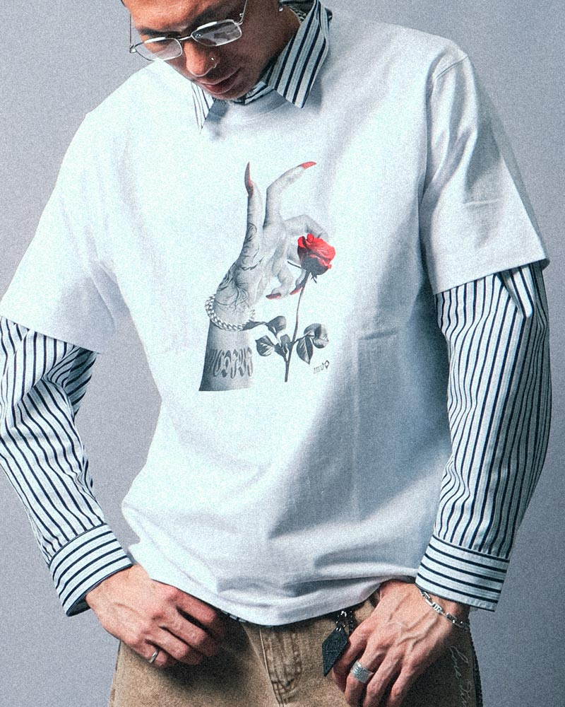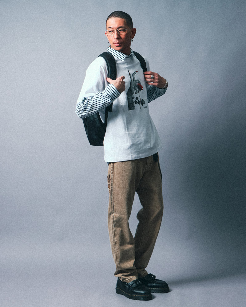 着こなしの幅が広がる、レイヤードスタイル。レッドが差し色のTシャツを上に重ねることで、アクセントを効かせた着こなしに。もちろんTシャツの上からラフに羽織るスタイルも楽しむことができ、シーンに合わせたアレンジが可能です。リュックを合わせれば、よりカジュアルな印象に。羽織りとしてもインナーとしても活躍する、この季節おすすめのアイテムです。