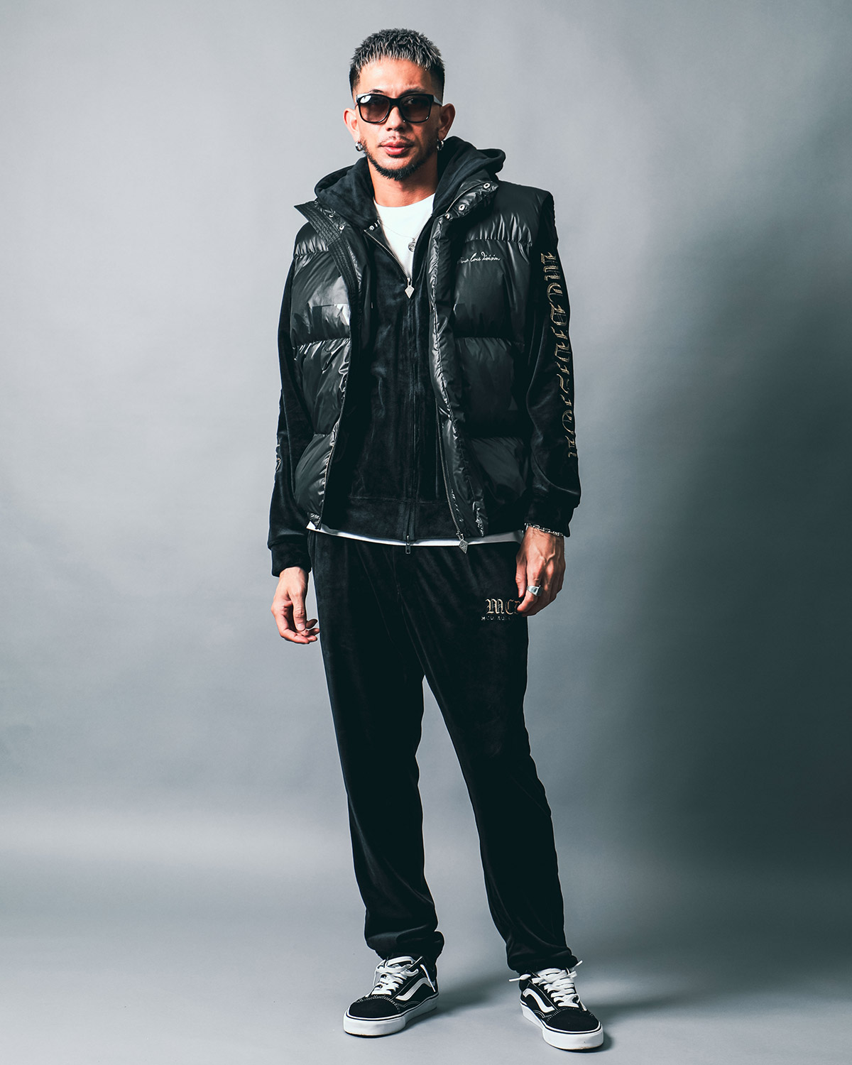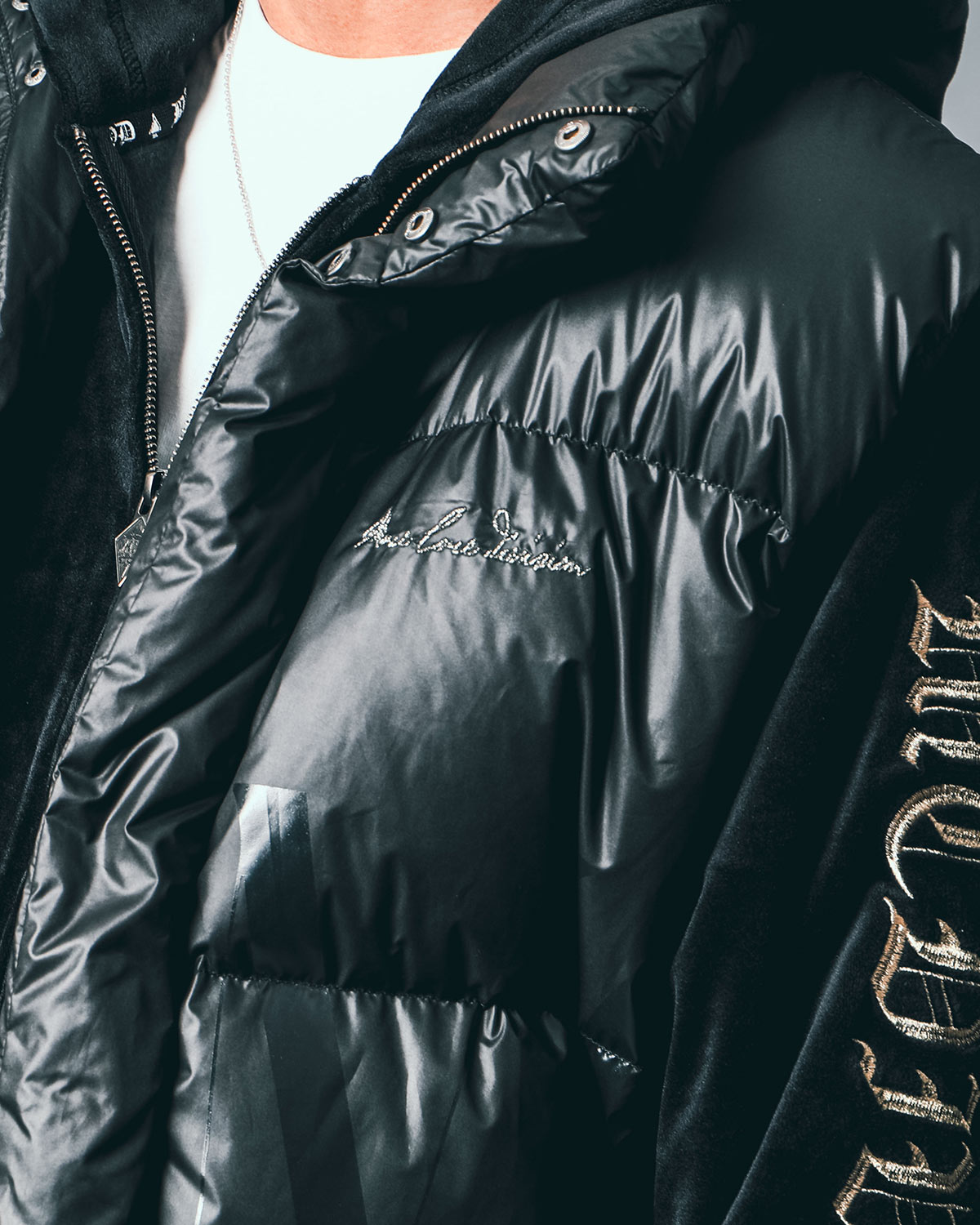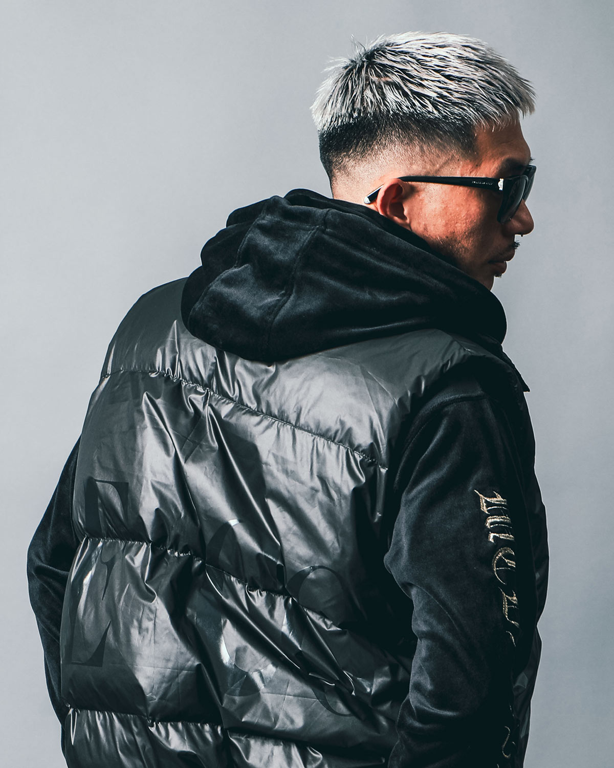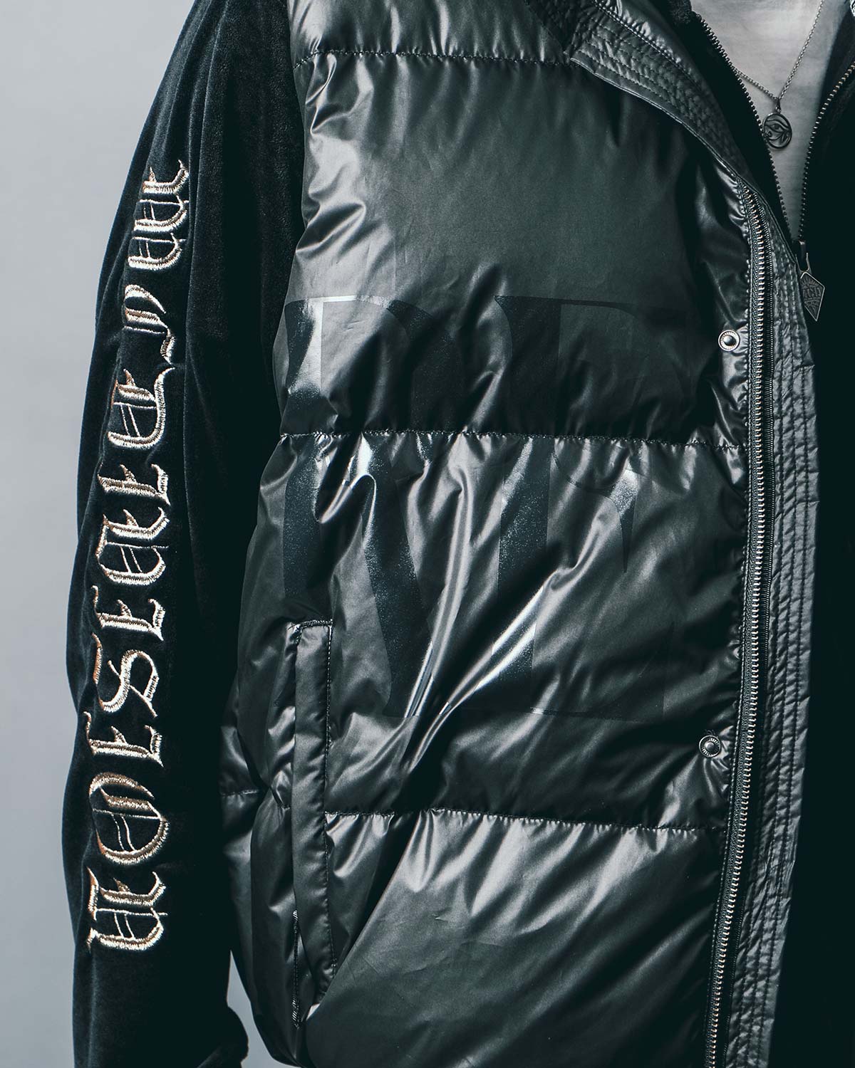 上品なツヤ感を放つ光沢生地、そして胸元とフードにはラメ刺繍を施し、さりげない輝きで高級感を演出。また、ボディと同色のビッグロゴプリントを採用することで、遊び心もありつつ主張しすぎないちょうど良いバランスに。