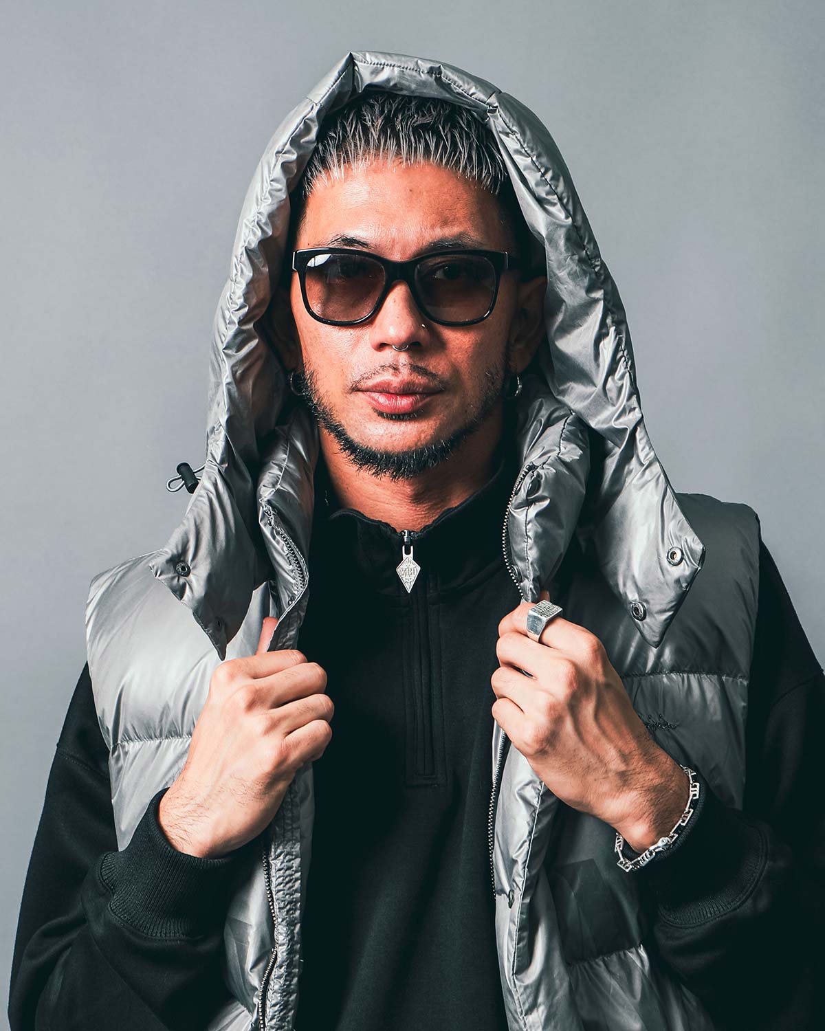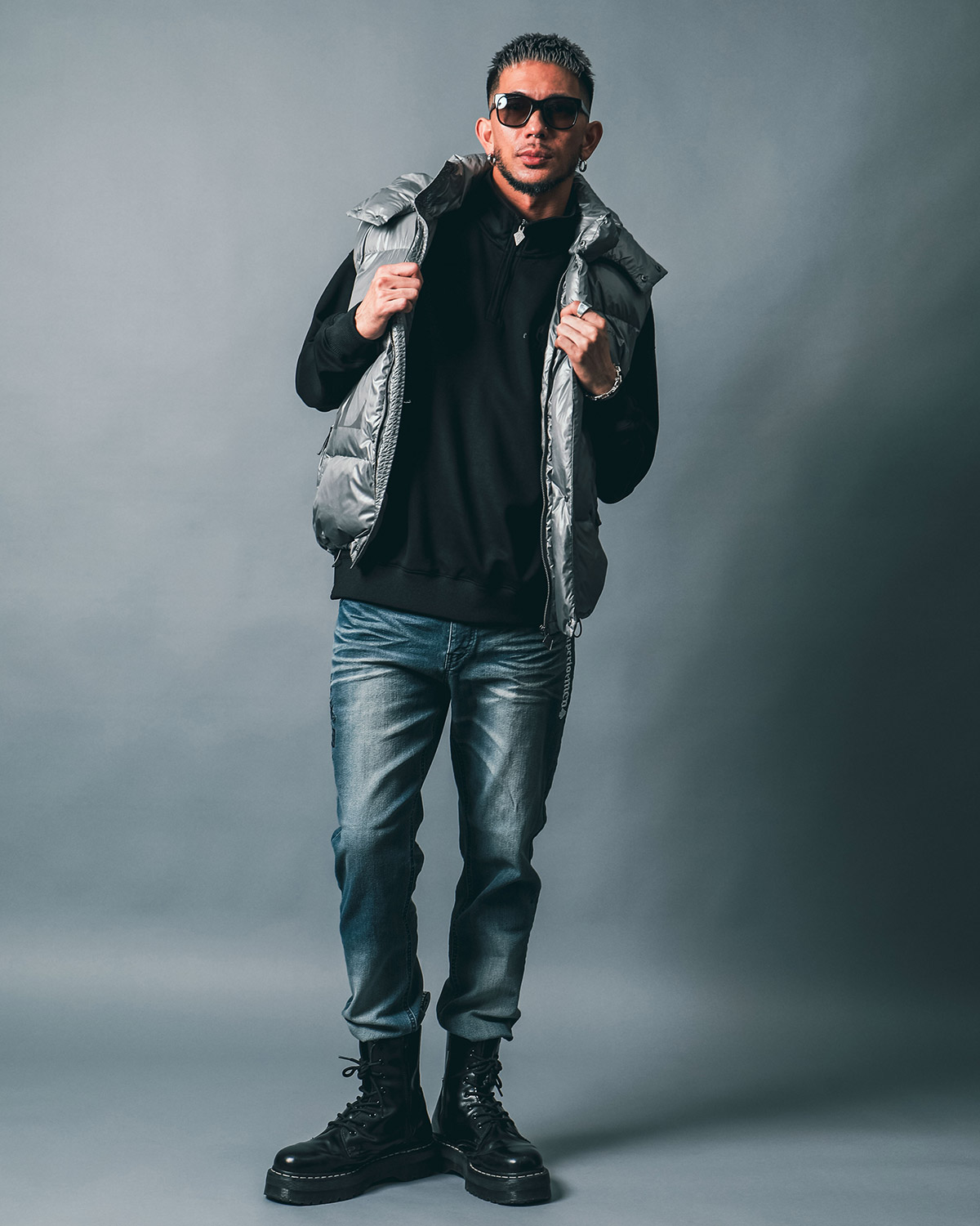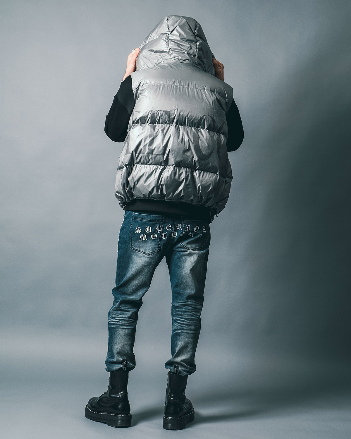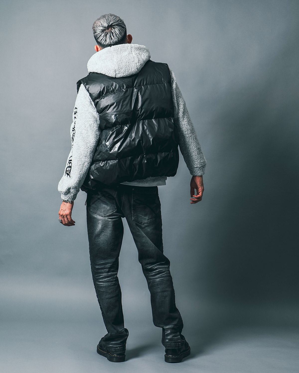 上品なツヤ感を放つ光沢生地、そして胸元とフードにはラメ刺繍を施し、さりげない輝きで高級感を演出。また、ボディと同色のビッグロゴプリントを採用することで、遊び心もありつつ主張しすぎないちょうど良いバランスに。