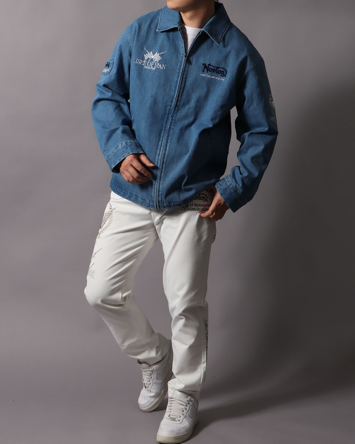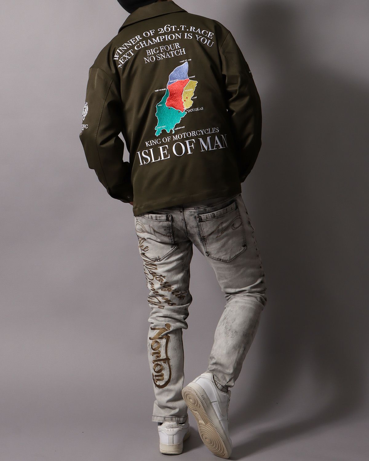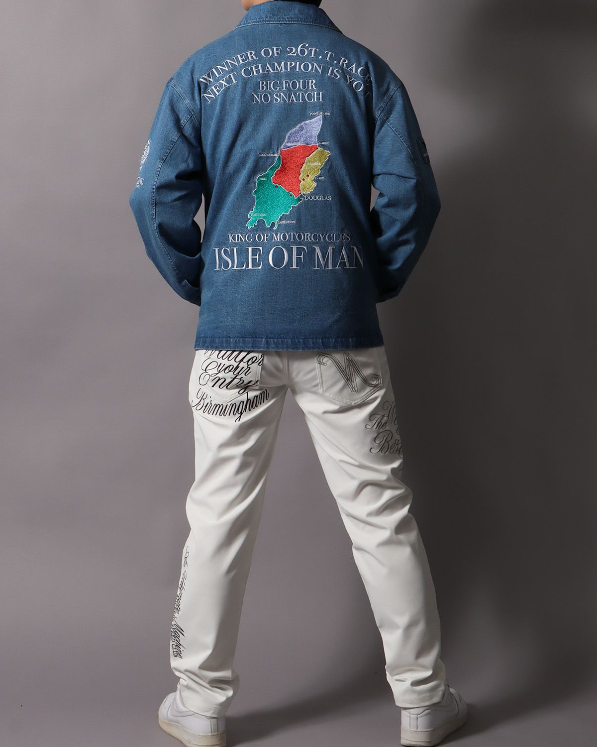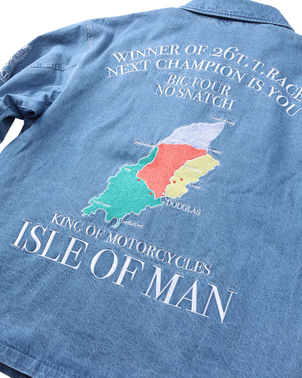 爽やかなデニム生地に、大胆に落とし込んだ『ISLE OF MAN』モチーフ。