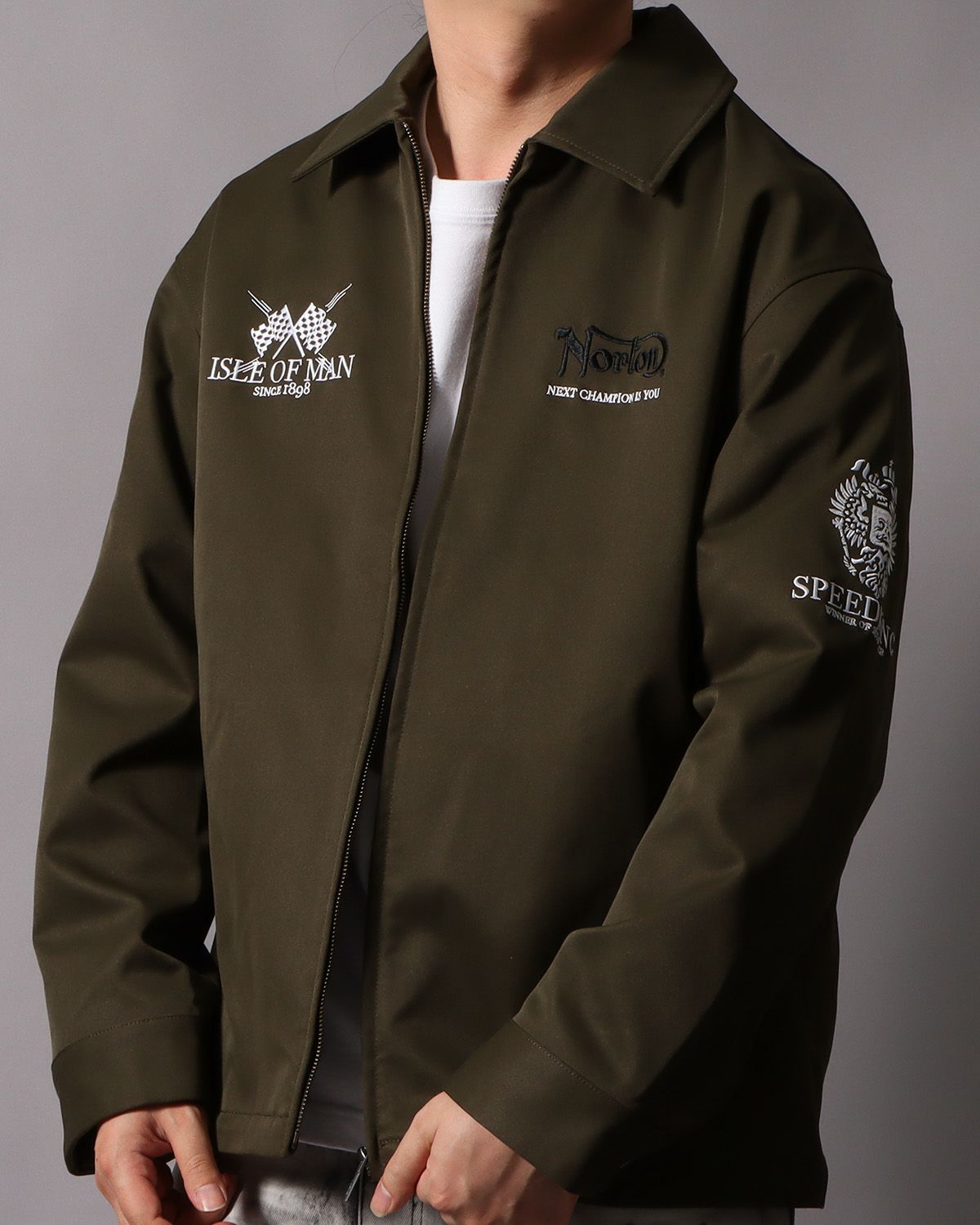 『ISLE OF MAN』モチーフを、カーキのボディに合わせたナチュラルに映える1着。