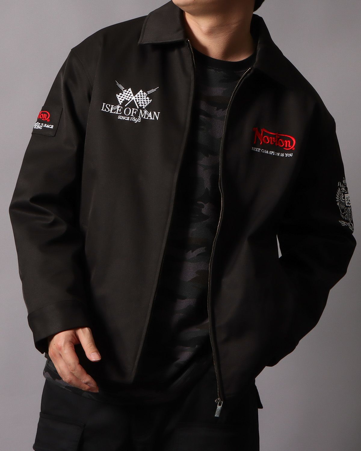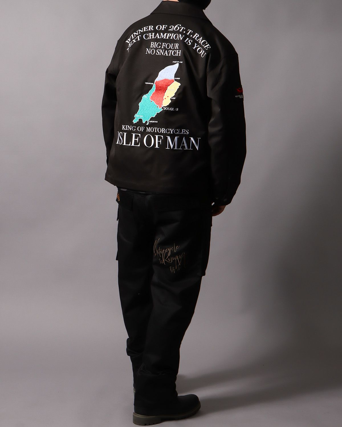 存在感と落ち着きを融合した『ISLE OF MAN』x ブラックカラー。 ベーシックなブラックカラーをベースにすることでメリハリがうまれ、柄の鮮やかな色味が引き立ち、存在感をより一層際立たせる。 フロントや袖に施したレッドカラーの刺繍もアクセントとして映える1着。 コーデもオールブラックでまとめ、シックな雰囲気の中に個性が光るスタイルに。