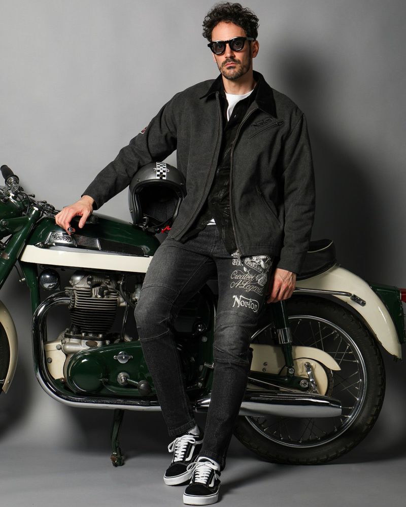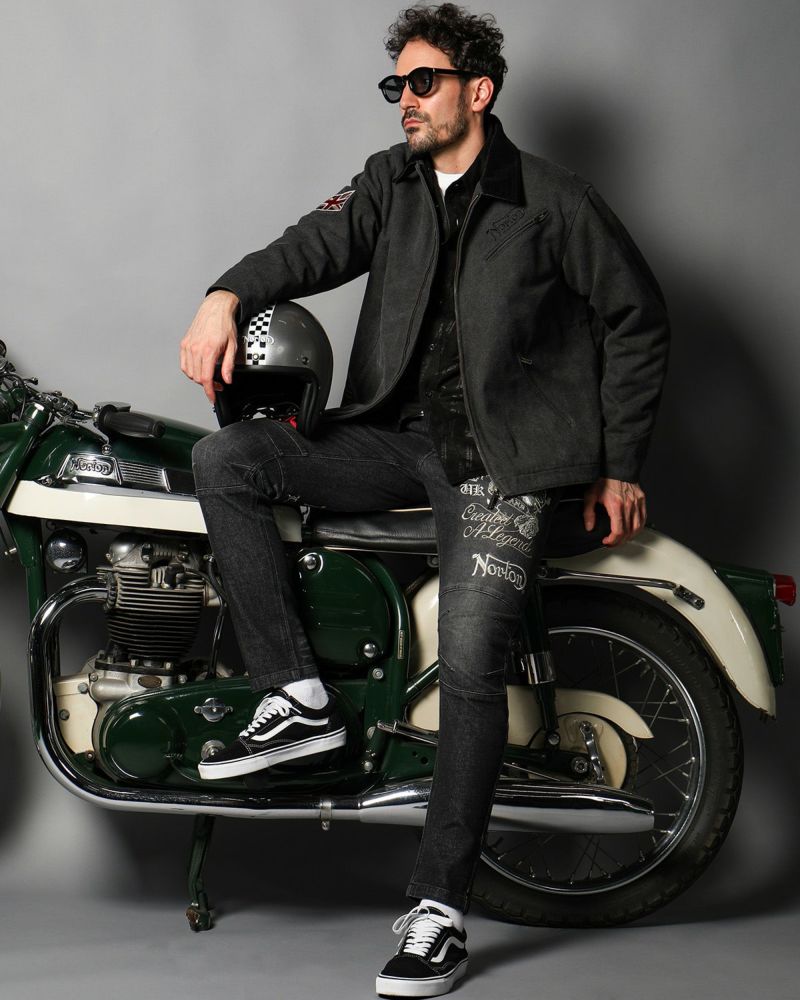 トリコロール配色でNortonらしさを存分に表現したジップパーカー。ユニオンジャックやウィング、チェッカーフラッグ、バイクブーツ、I♡UKなど多彩なモチーフを盛り込み、ブランドの世界観を詰め込んだデザインに仕上がっています。