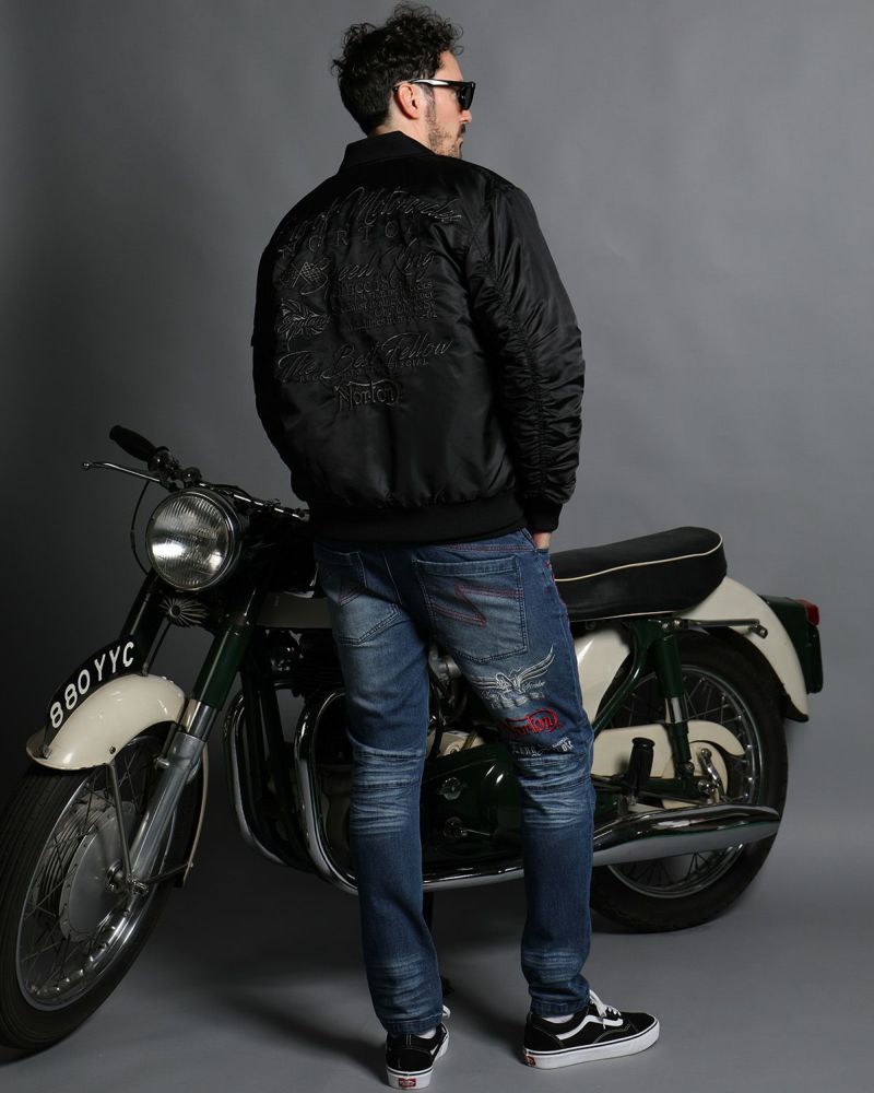 大胆なイーグルとローズのモチーフが視線を奪う、迫力満点のロングパンツ。Nortonならではの重厚感と高級感を、細部にまで施された刺繍で表現しています。