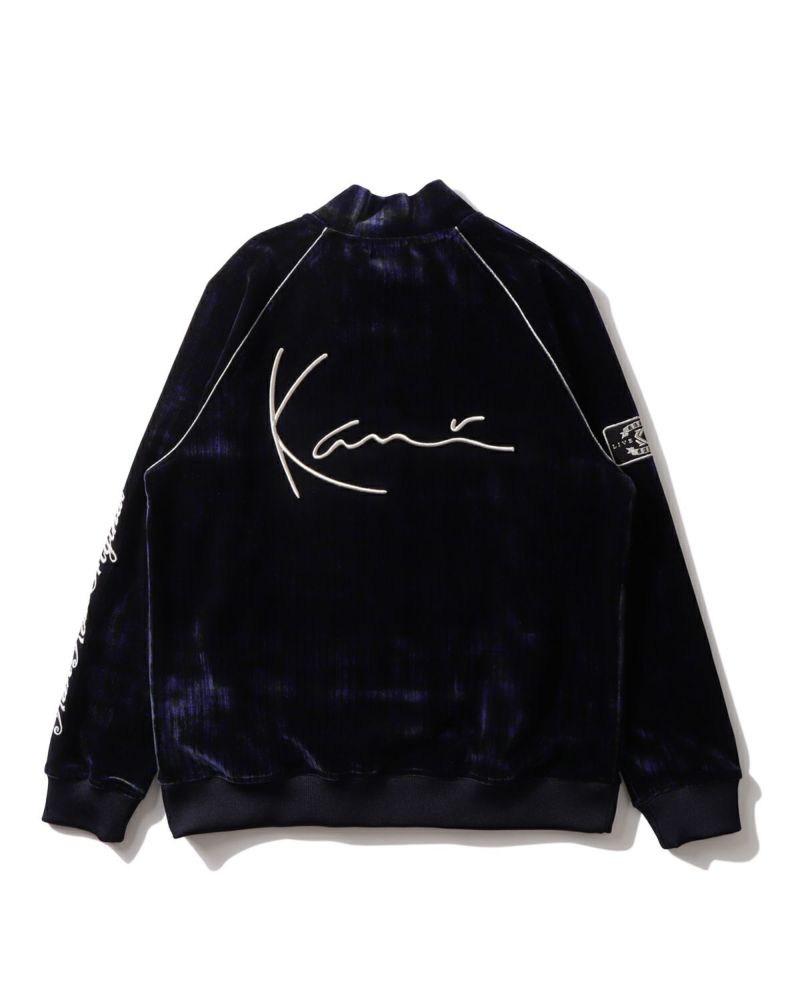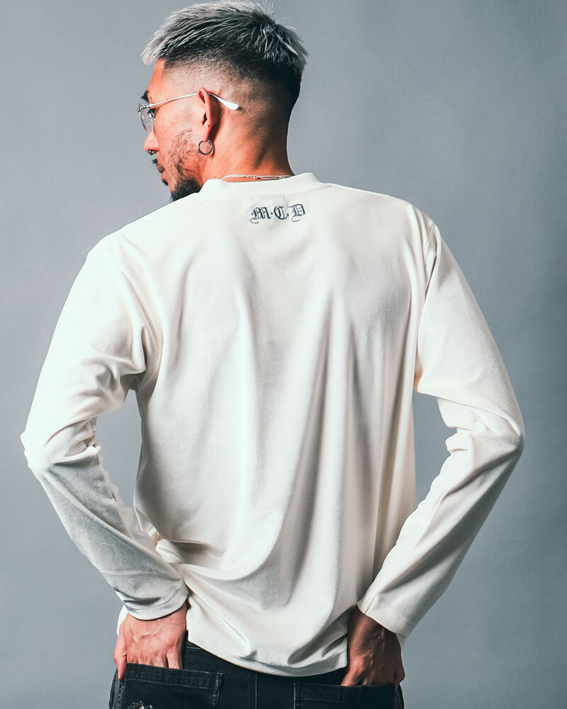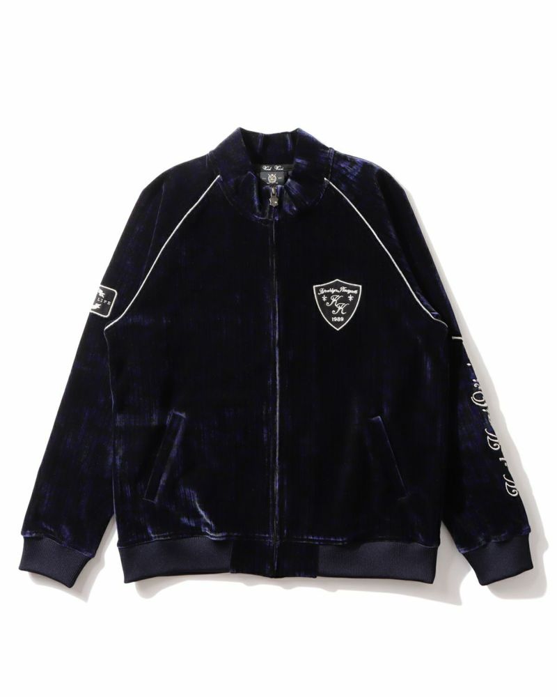 ムラ感のある独特の生地に、シルバーのパイピングや3Dロゴ刺繍、エンブレムのアップリケを組み合わせ、存在感のある一着に仕上げました。