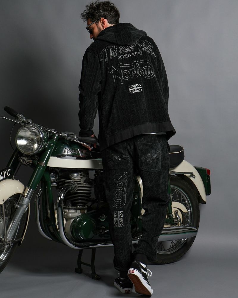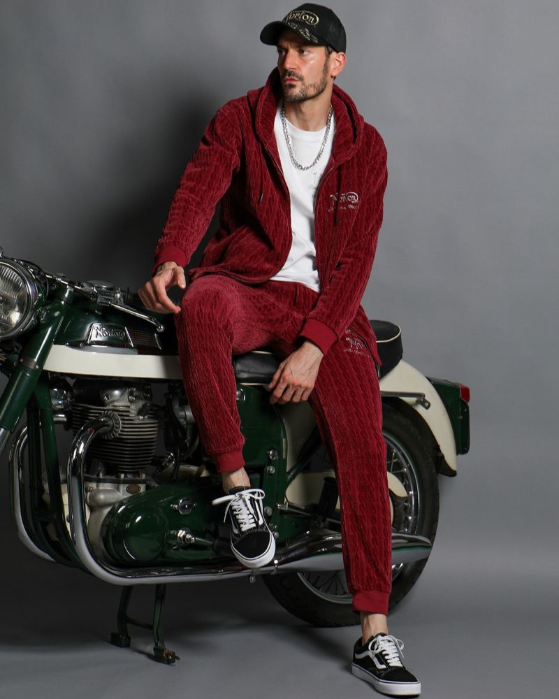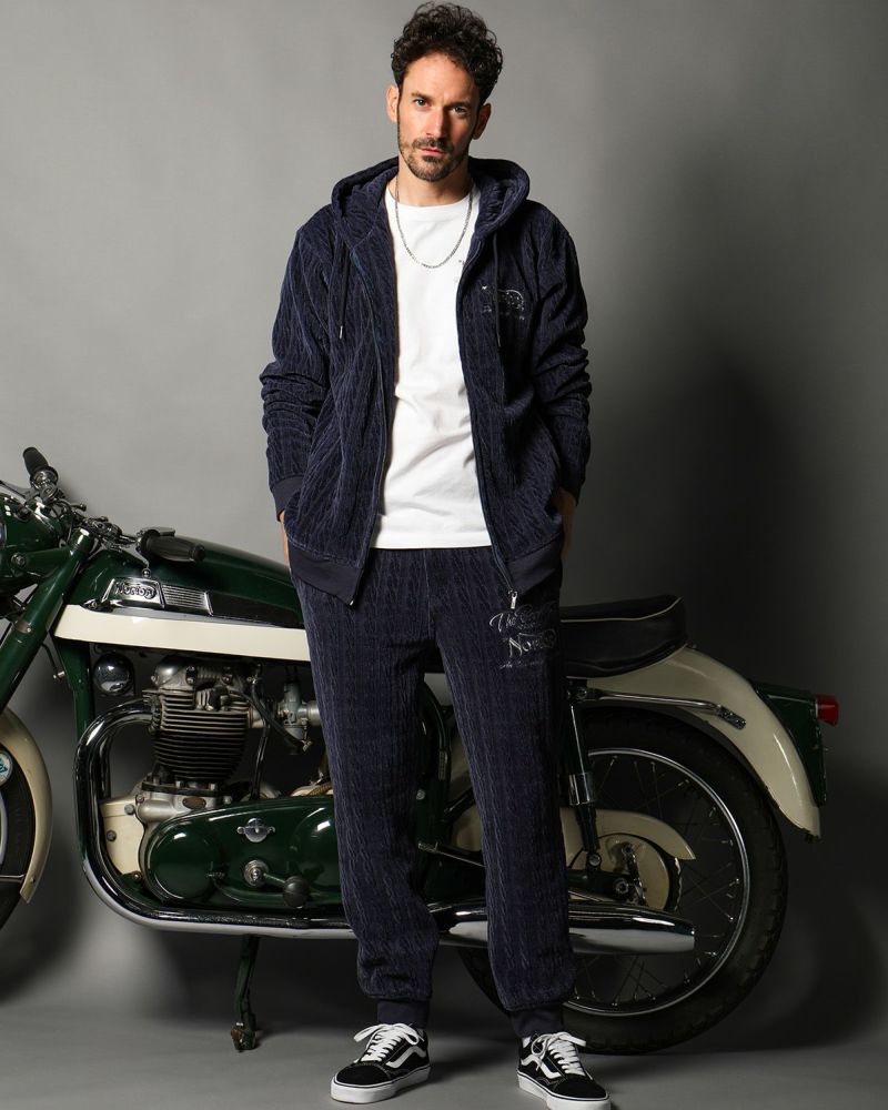 パンツはスピンドル仕様でフィット感が良く、ベロア生地ならではの適度なハリがラフすぎない綺麗なシルエットをつくります。